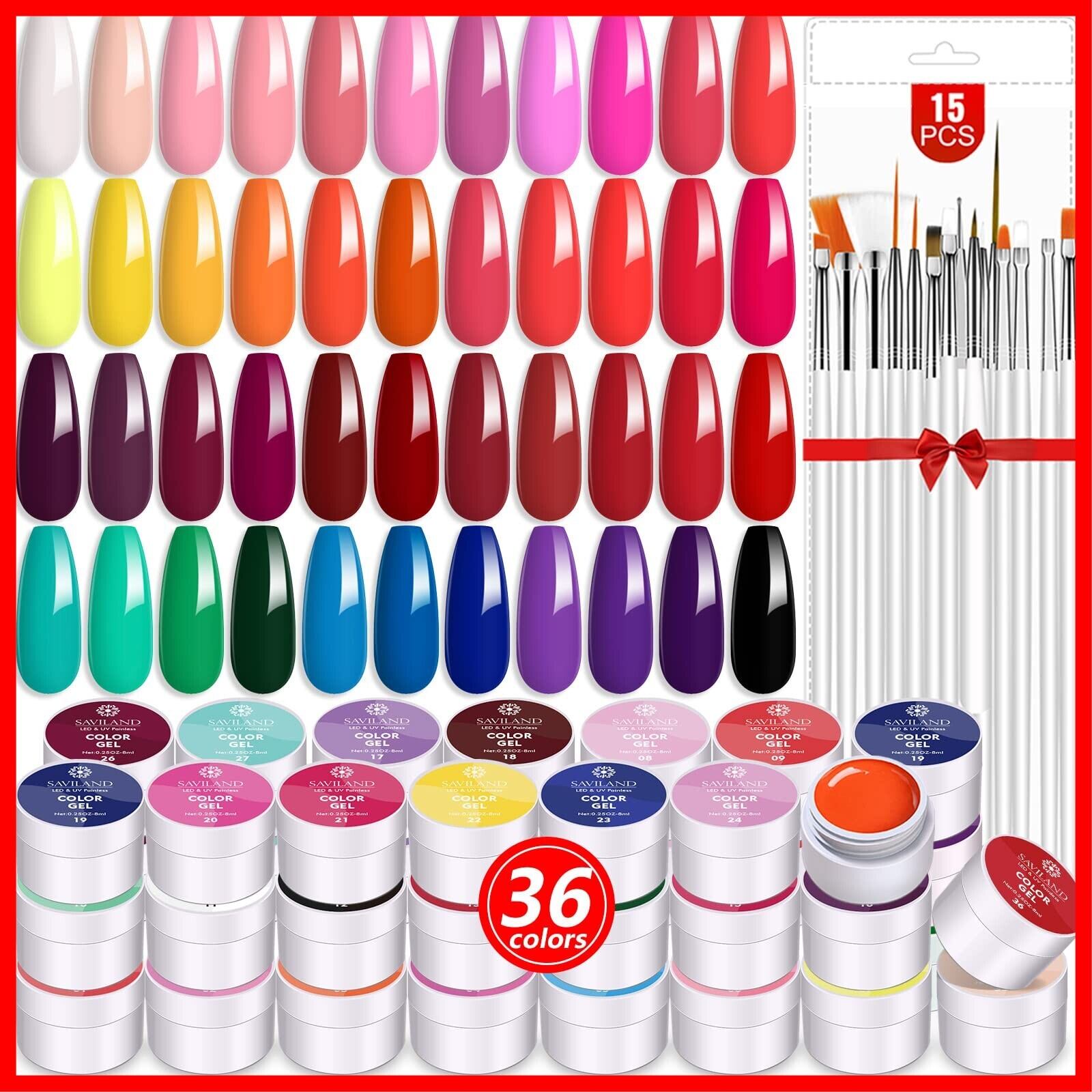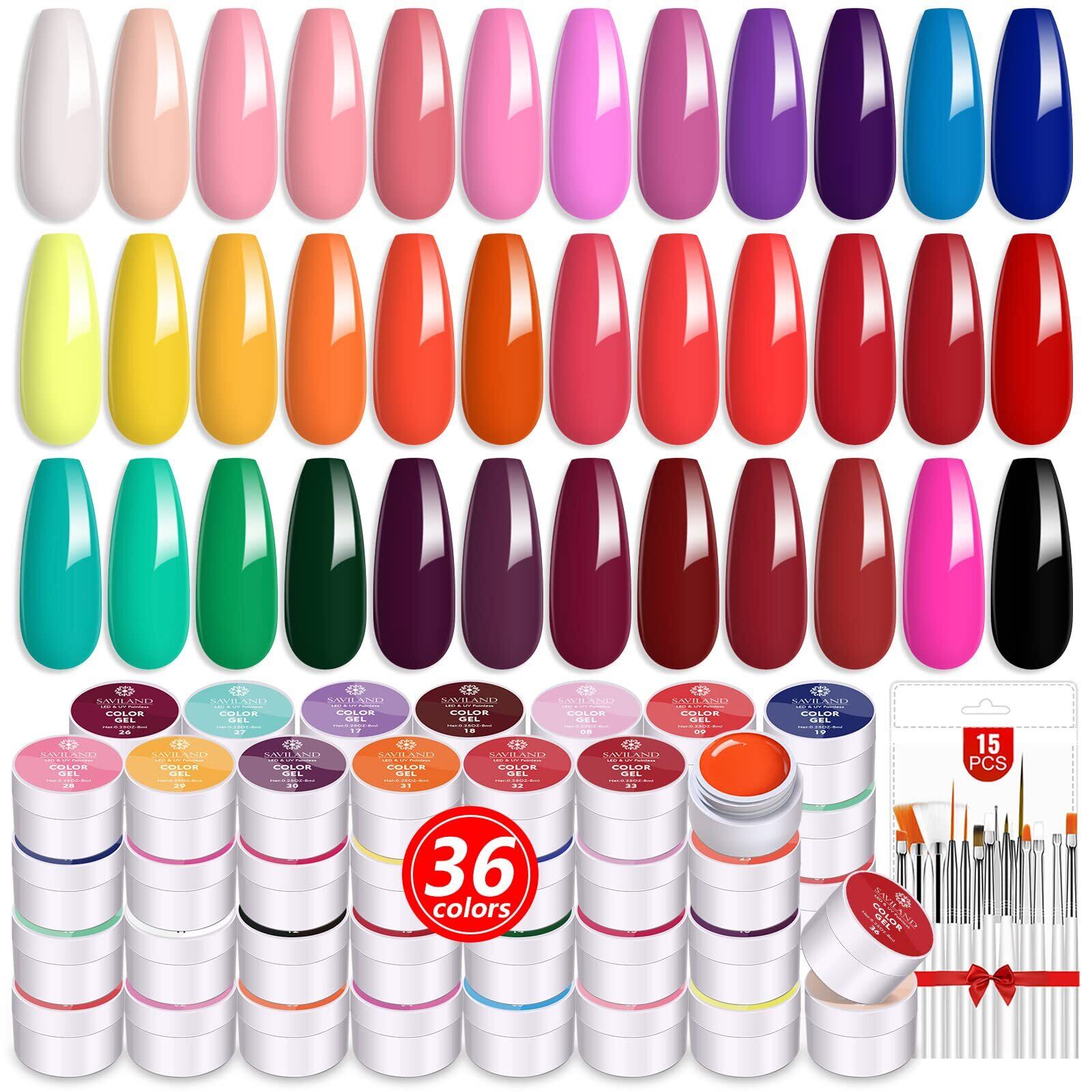 Saviland 36色 ジェルペネイルキット 春夏 カラージェルネイルポリッシュセット 15個のネイルブラシ付きDIY ネイルアートデザイン UV/LED対応 ネイルサロン用の描画ネイル筆 36色*8ml