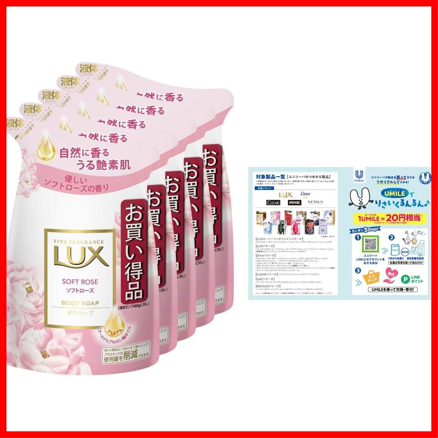 LUX(ラックス) ボディソープ ソフトローズ 詰替え用 300g×5個 リーフレット付きき ボディーソープ 優しいソフトローズの香り(香料配合)。