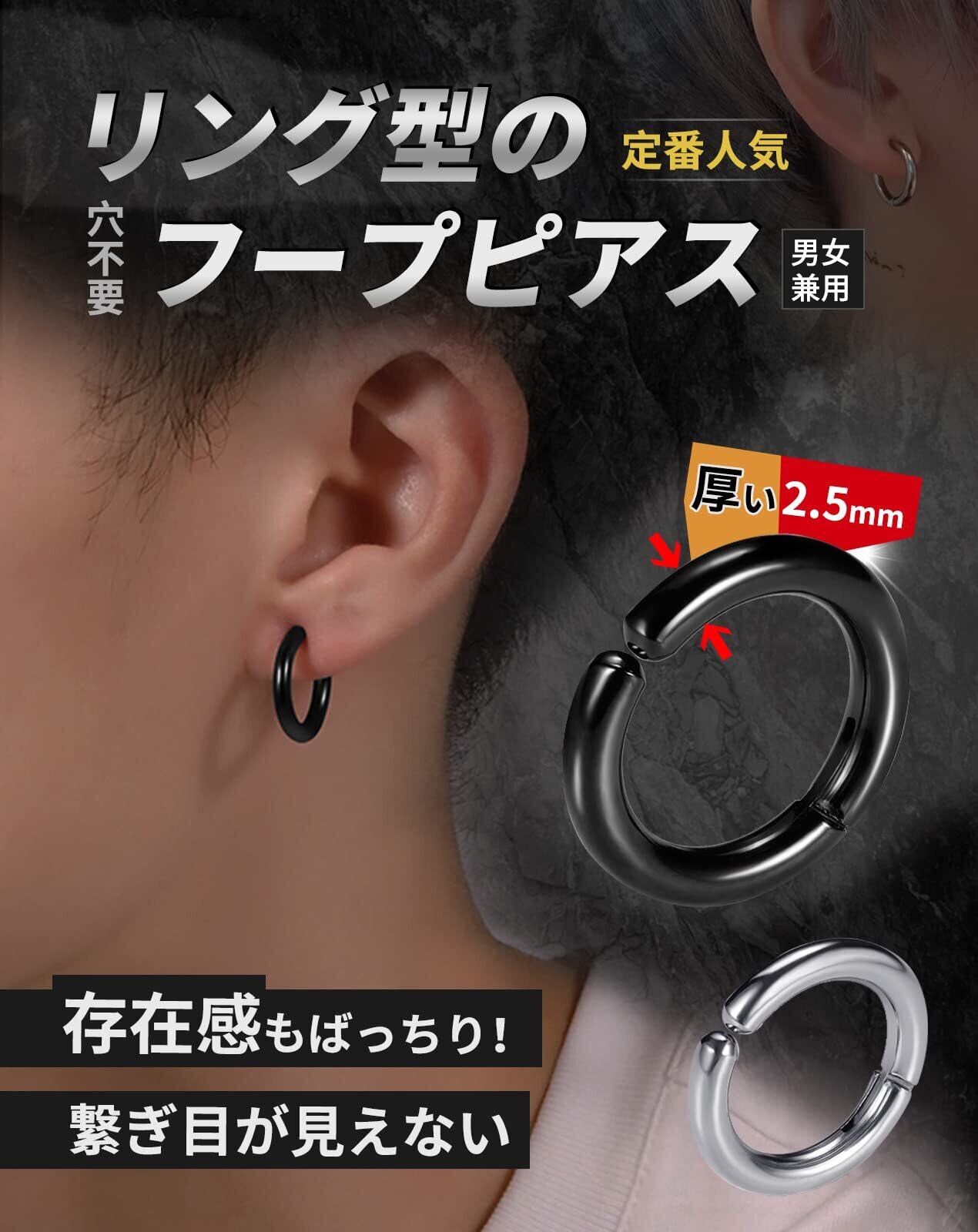 【選べる4サイズ】リング内径は約10mm,12mm,14mm,16mmサイズ(外径は約15mm,17mm,19mm,21mm)からお選びいただけます。フープ幅:約2.5mm 幅約2.5mm幅の華奢で美しい、繋ぎ目の見えない太いフープピアス風です。わっか状のシンプルなデザイン、豊富なサイズで、自分にあったサイズが見つかる!大人シンプルスタイルに一点投入で全体のバランスが整います。メンズでもレディースでも使えるおしゃれなノンホールピアスです。