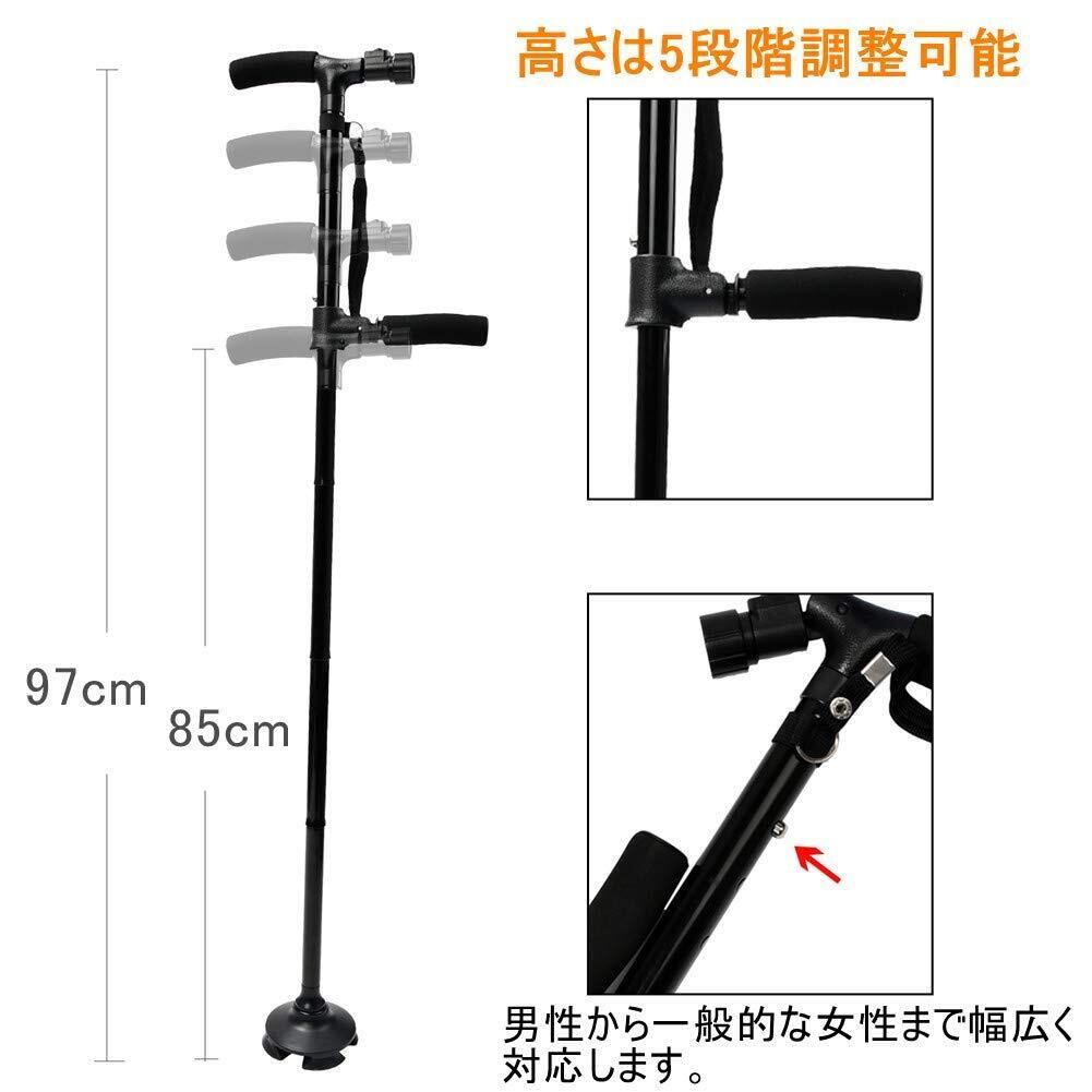 【LEDライト付き・5段階調整・伸縮】45°調整可能なLEDライト付きなので暗い夜道でもお使いいただけます。LR44電池x4付き。柄の長さは握りの高さを決めるために大切なものです。使う人の姿勢によっても適切な高さが変わる5段階調整できる杖です。杖の高さは85cm~97cmまで高さを調整できます、150cm~185 cmまで男性でも、女性でも幅広くご対応させていただきます。