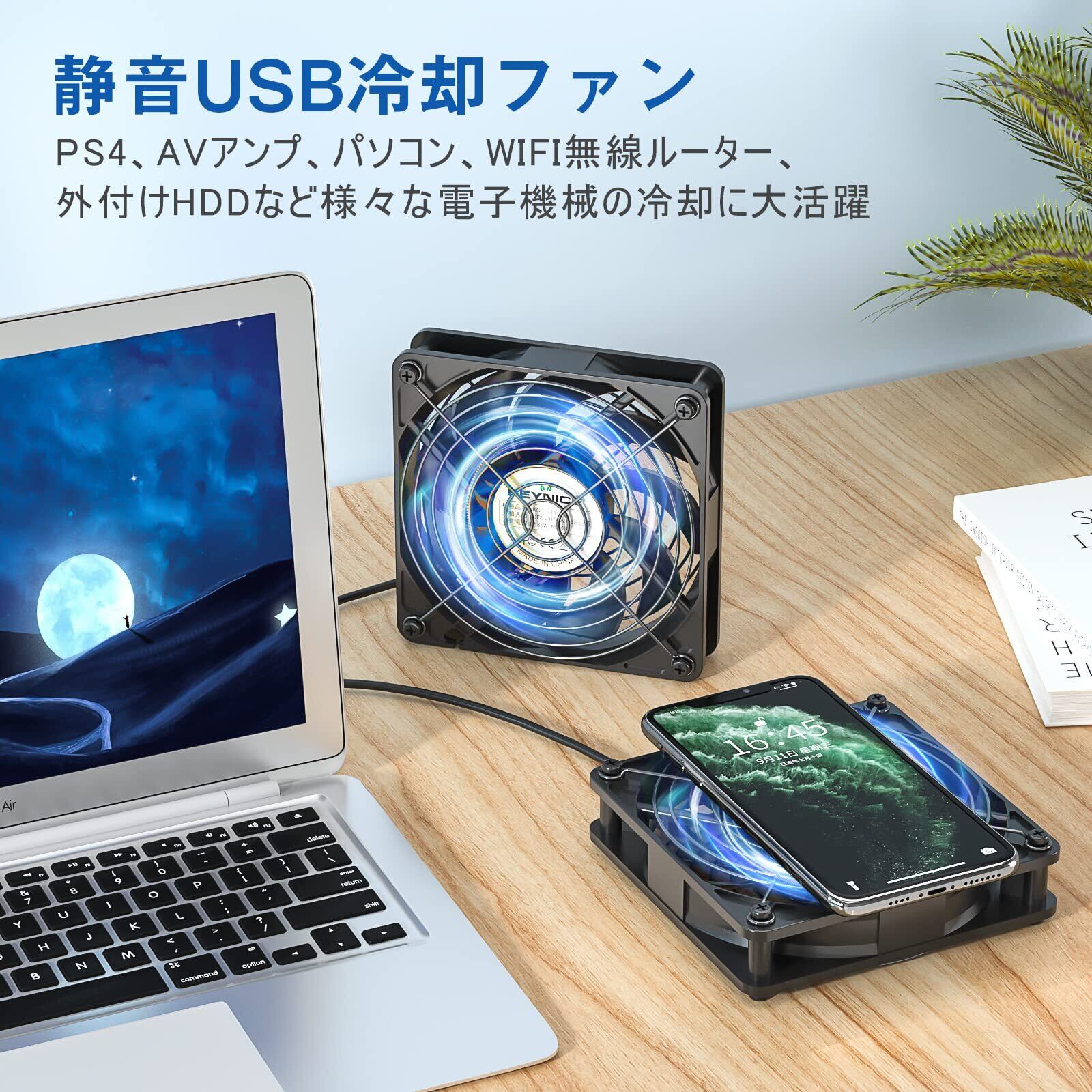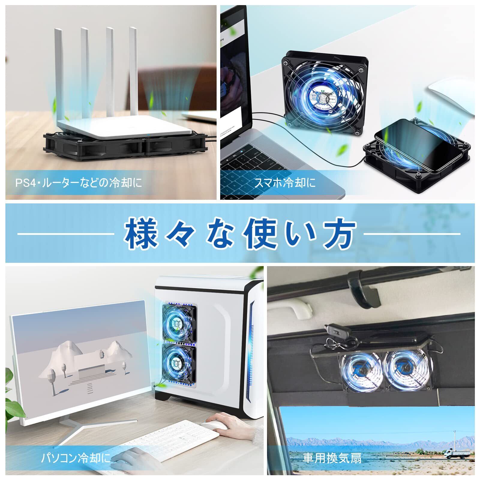 【多用途に対応】外付けHDD、ルーター、AV機器、スマートフォン、PC(デスクトップ・ノートPC)、ゲーム機(PS4など)の冷却に最適な設計で、熱暴走のリスクを軽減します。また、卓上扇風機としてや車中泊、屋外での使用、室内の空気循環など、様々なシチュエーションにも活躍します。