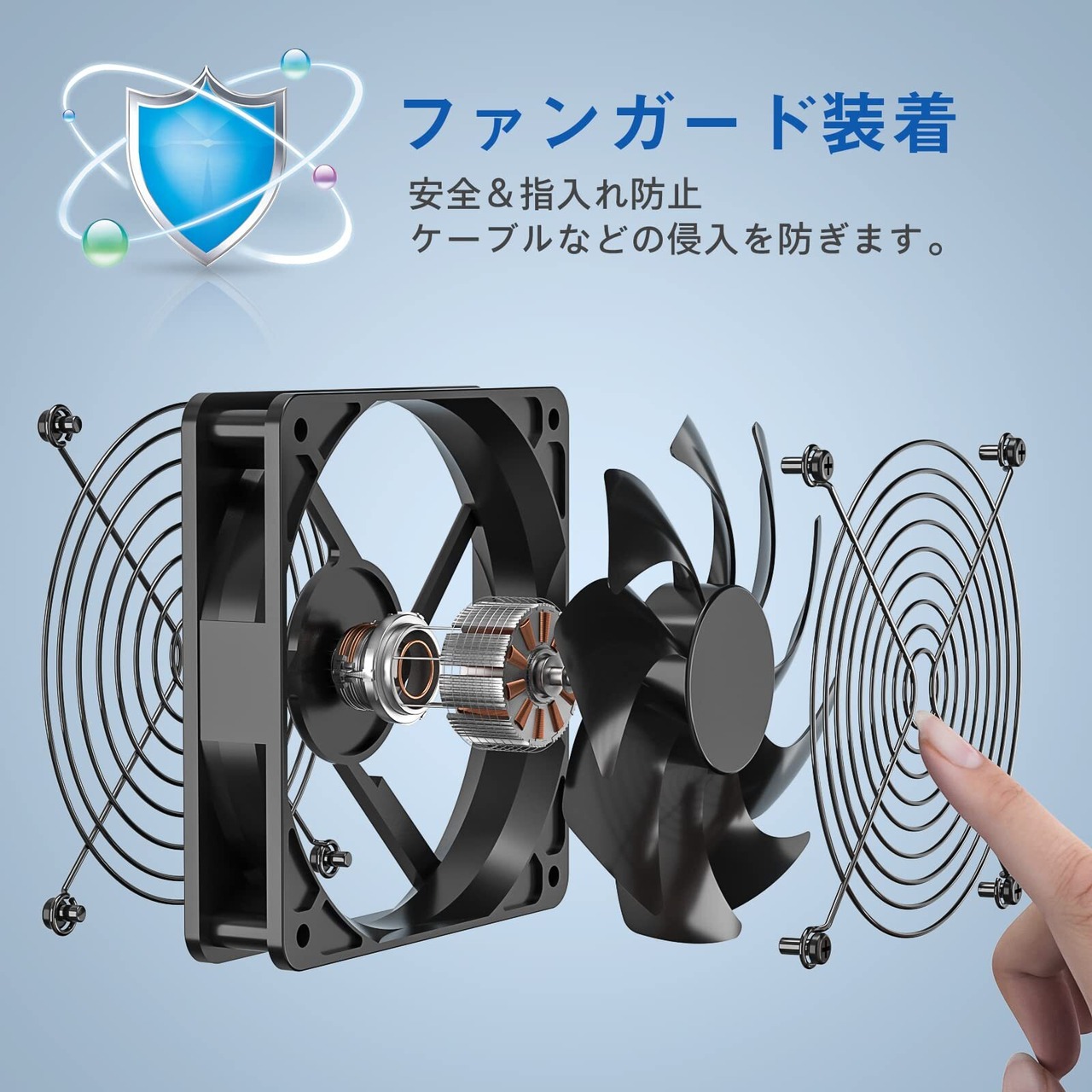 【静音設計】静音性に優れているため、オフィスや図書館など静かな環境でも気兼ねなく使用できます。両サイドには金属製のファンガードを備え、ケーブルなどの異物の侵入を防ぎ、安全性を高めています。また、動作中に誤って指を挟む心配もありません。
