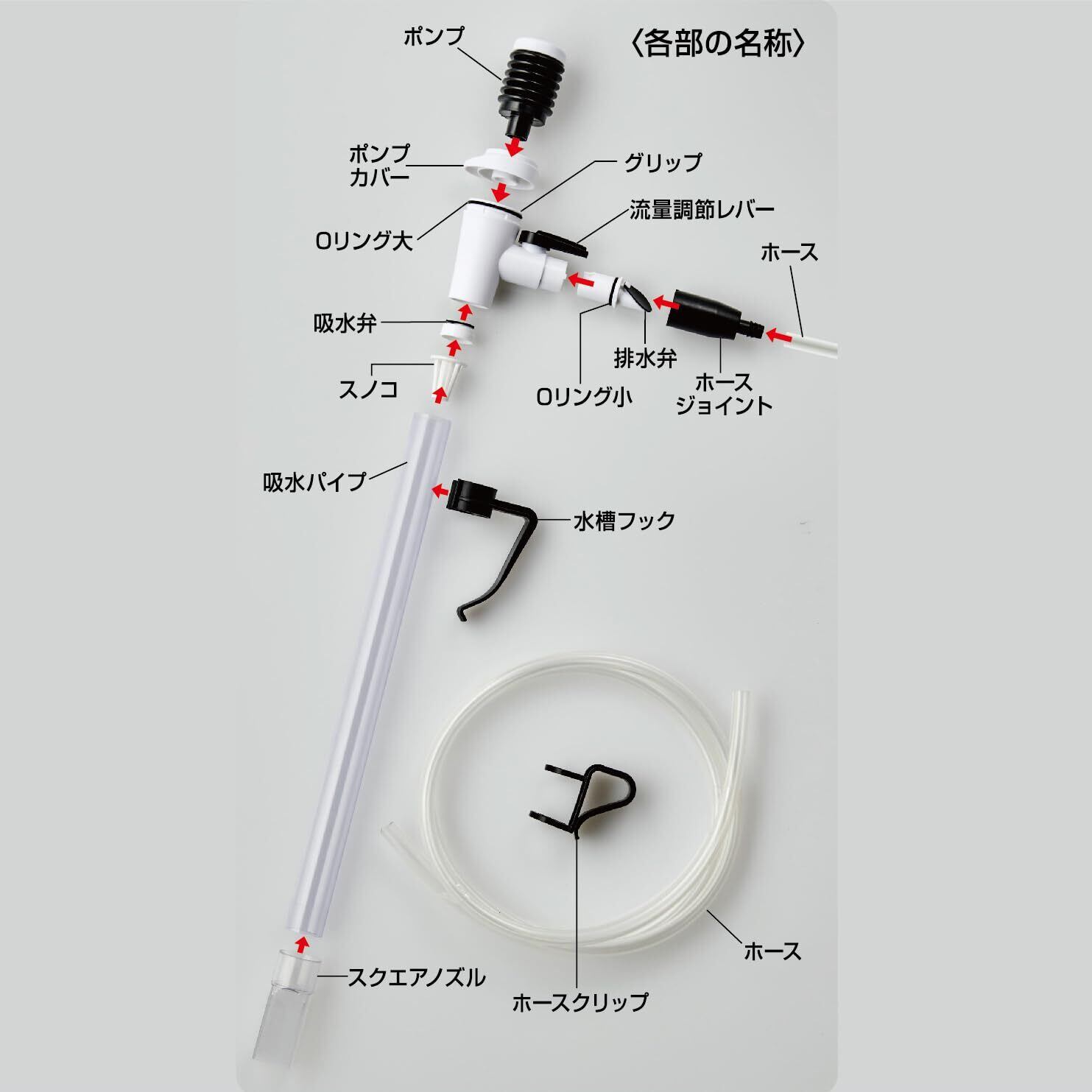 ●排水はポンプを数回押すだけで簡単スタート。●長めのパイプなので、底砂がたっぷり入った水槽でも奥までしっかり差し込んで、底砂の中まで掃除ができます。●排水ホースをバケツに固定するホースクリップ付き。排水中にホースがうっかりバケツから出るのを防ぎます。
