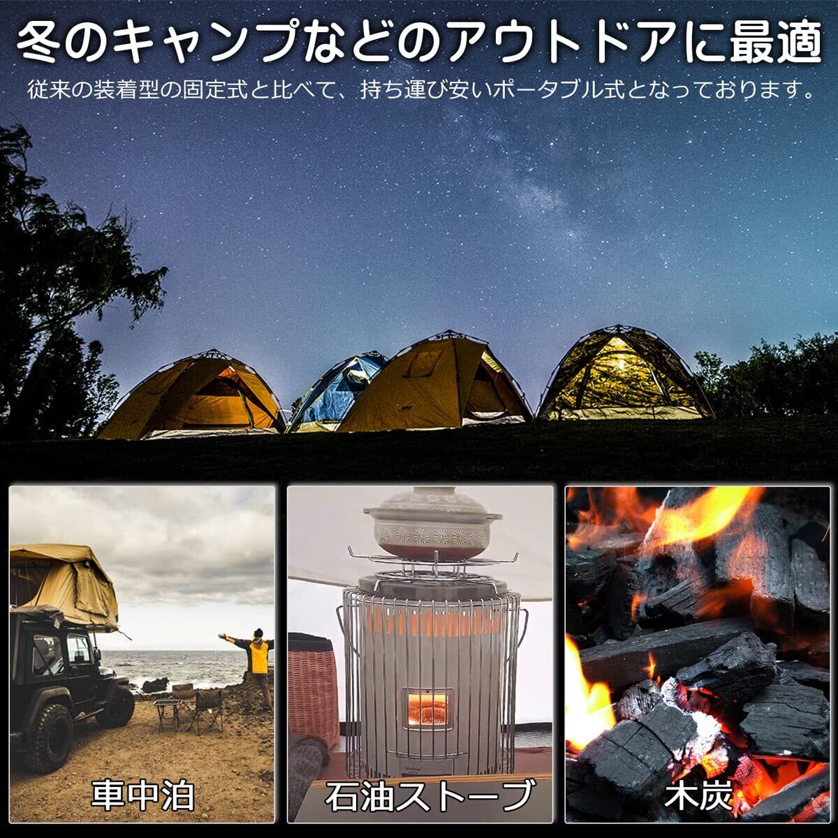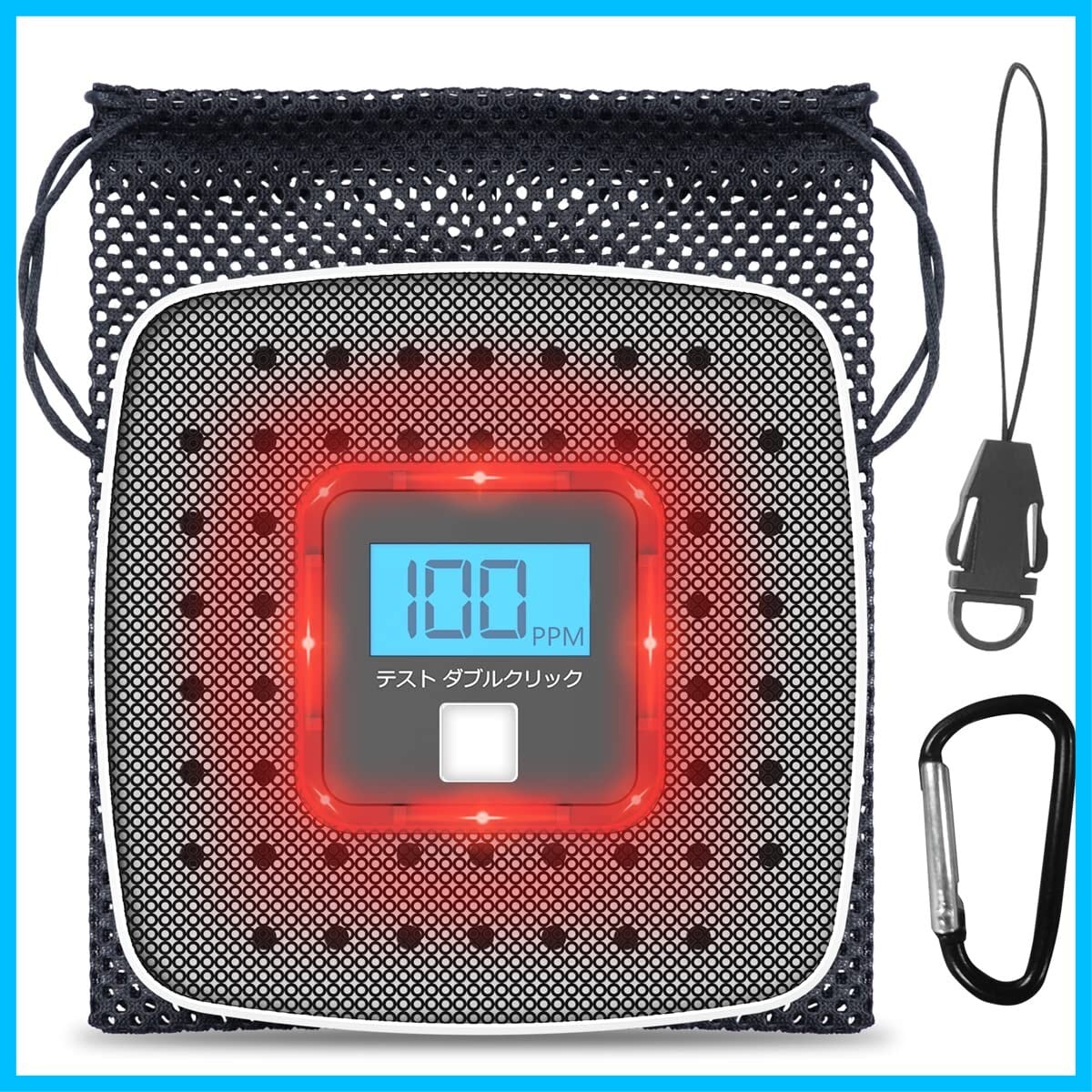 【携帯便利ための部品】①本体にストラップホールがあり、付属のストラップで吊り下げます。②本体を付属のメッシュ袋に入れてテントに吊り下げます。③あるいは付属のカラビナで気軽に本体を吊り下げます。一酸化炭素は上に行くからテント内で上部に吊り下げてください。