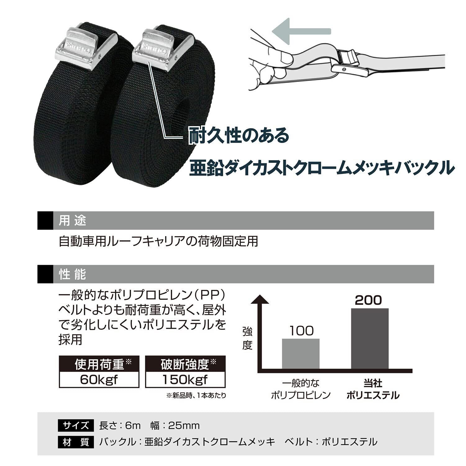 積載物をしっかり固定することができる高強度ベルト。大型ルーフラックの荷締めに便利な全長6m。