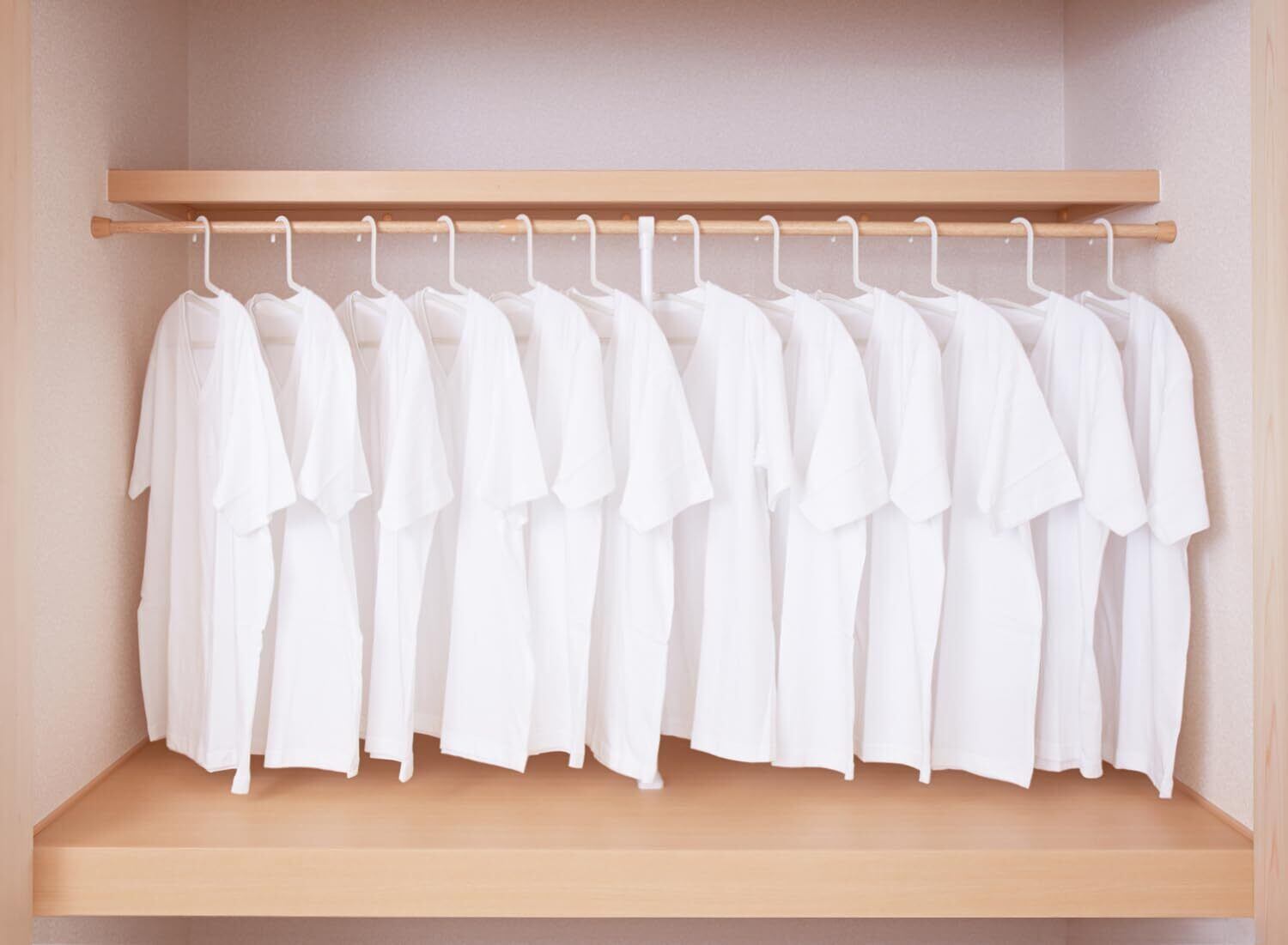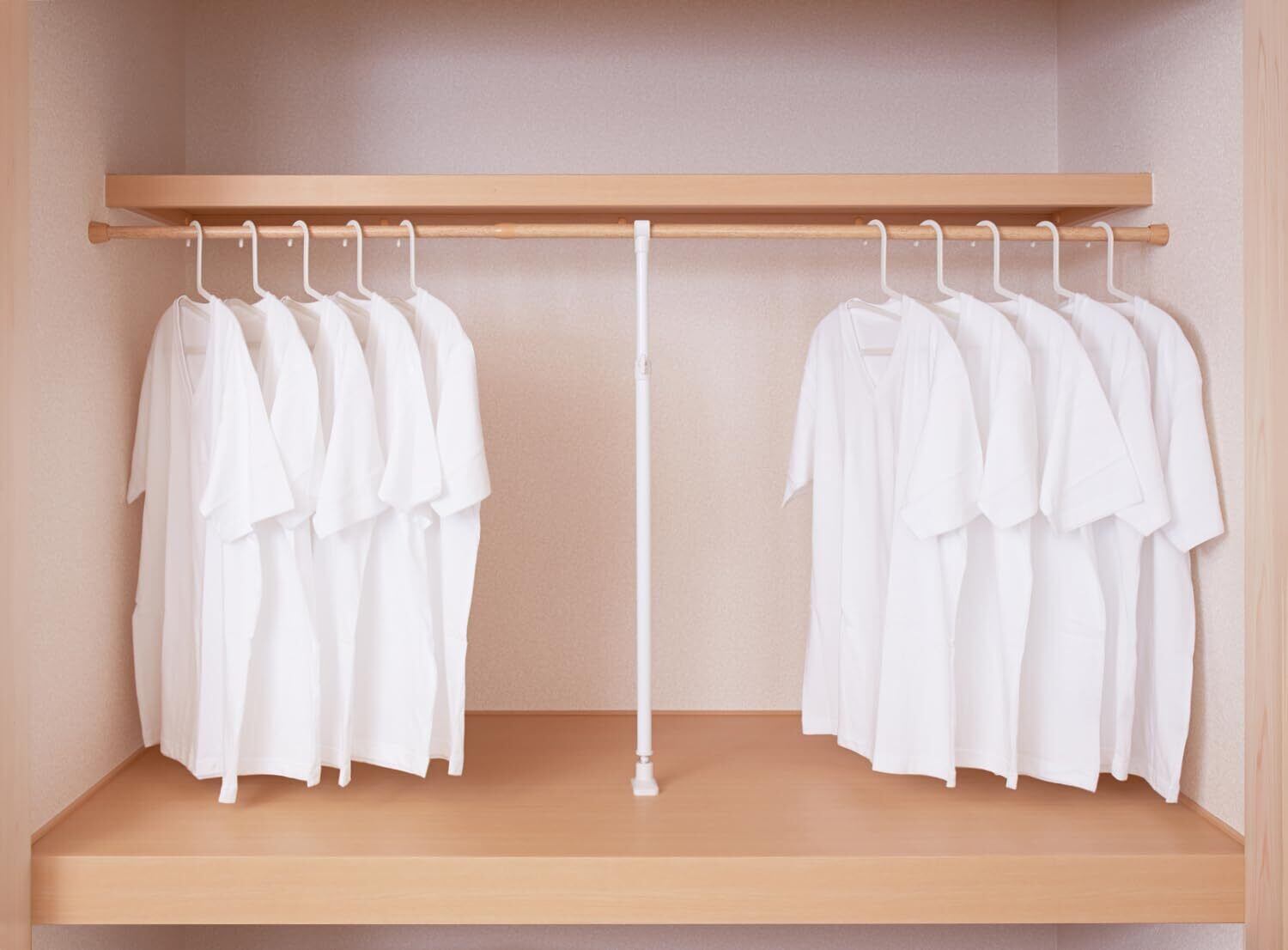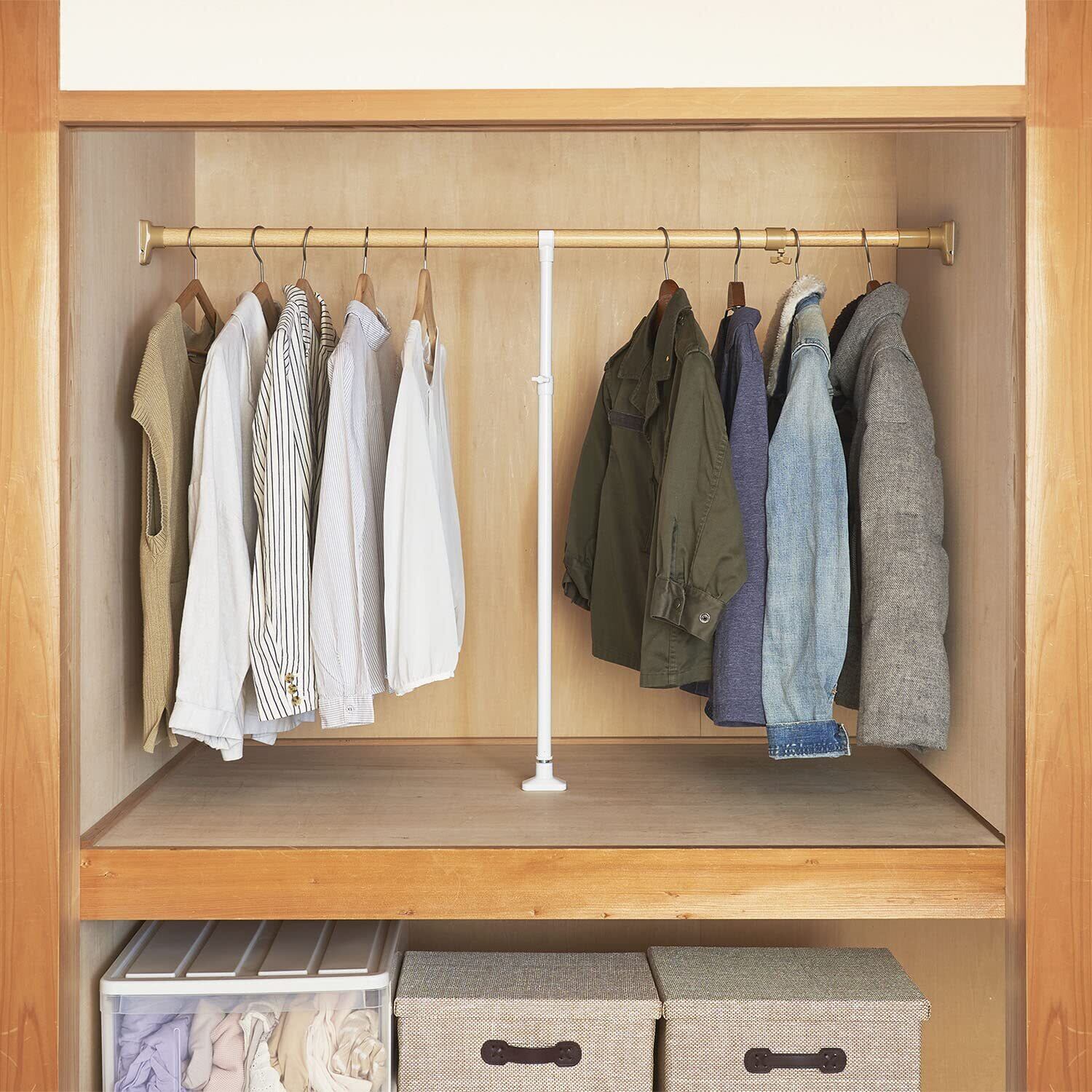 つっぱり棒の中央を支えることで、対荷重がアップ。つっぱり棒のずれ落ちも予防。たくさん洋服を掛けられます。