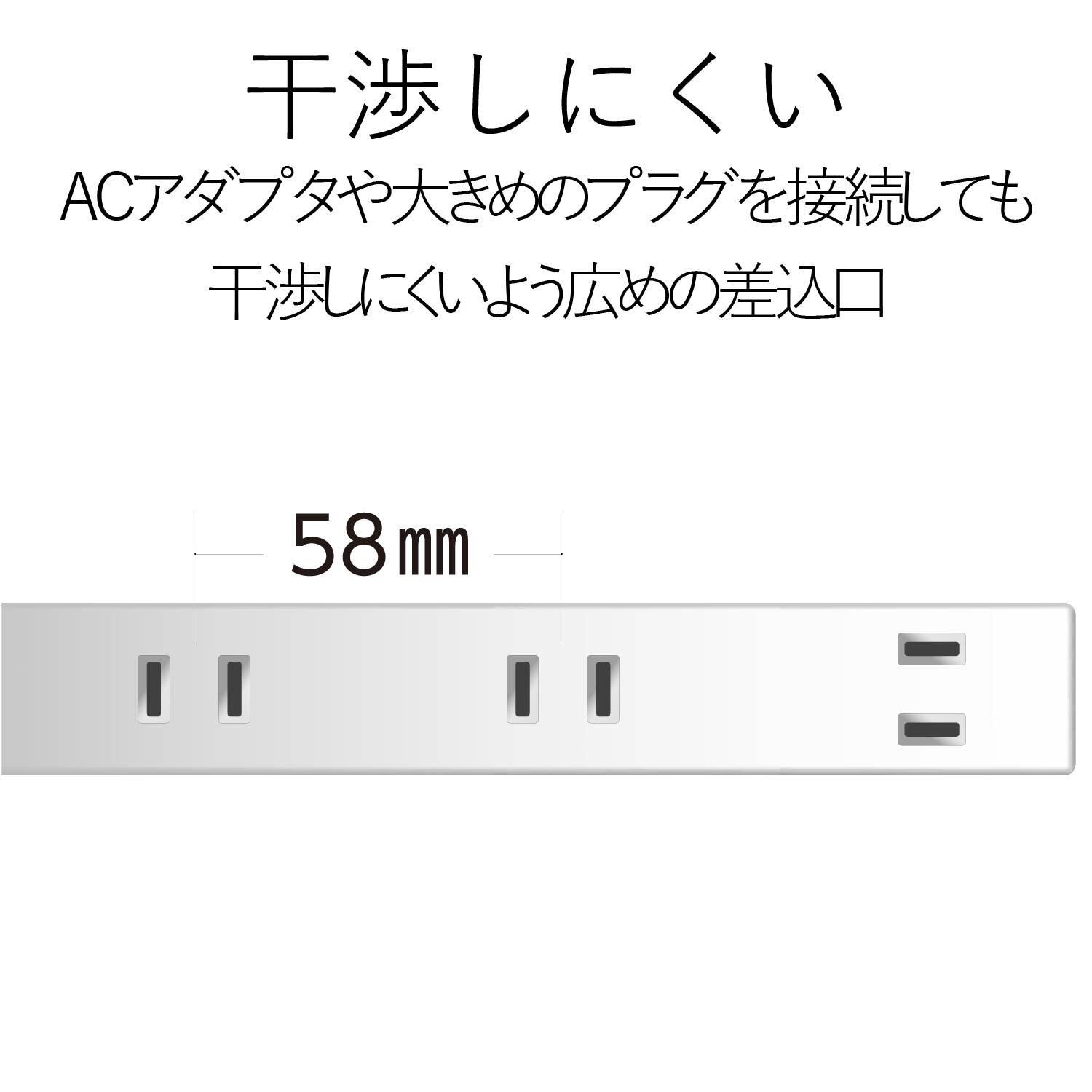 タップの差込口の間隔が約58mmと通常のタップと比較して広く、ACアダプタもすっきり接続可能です。