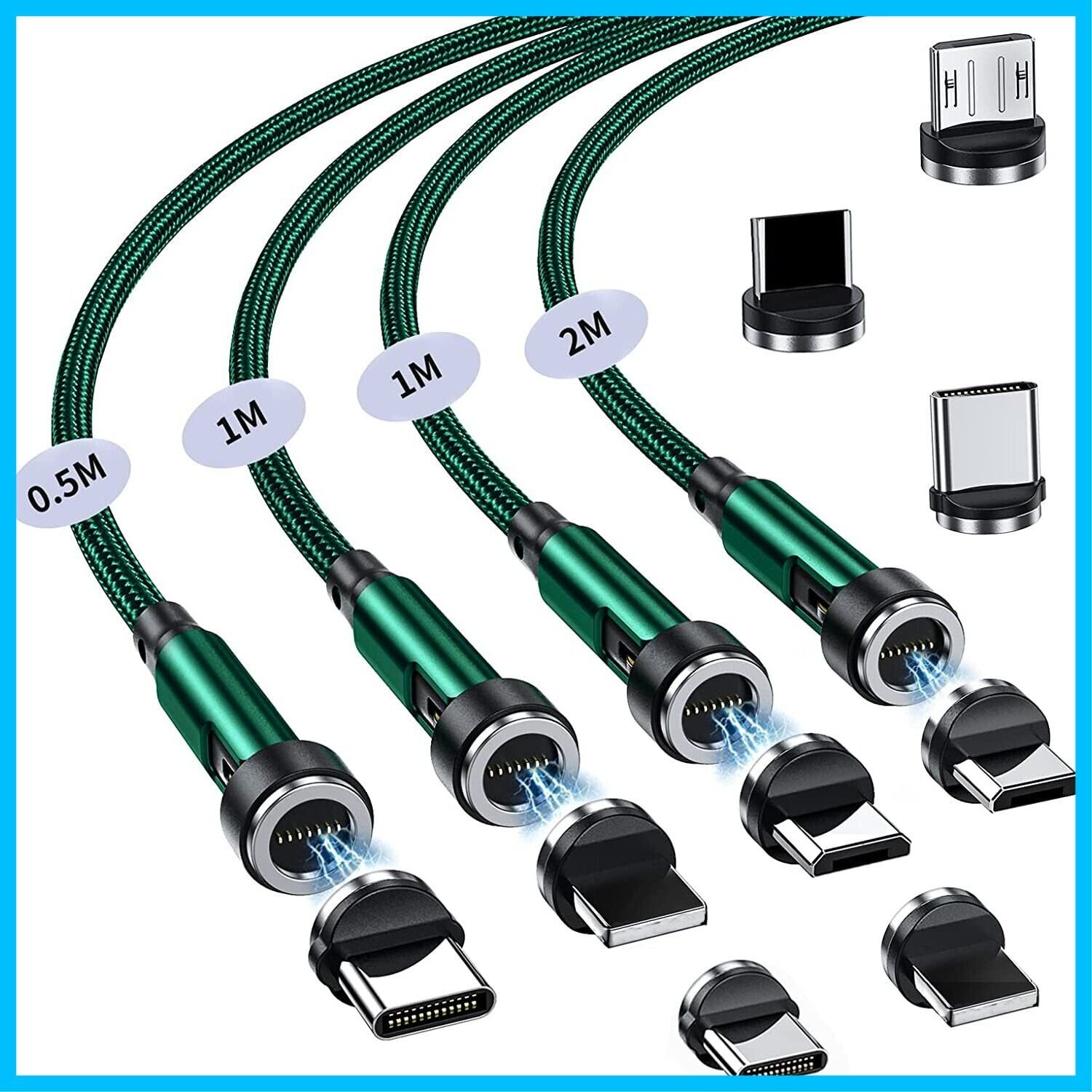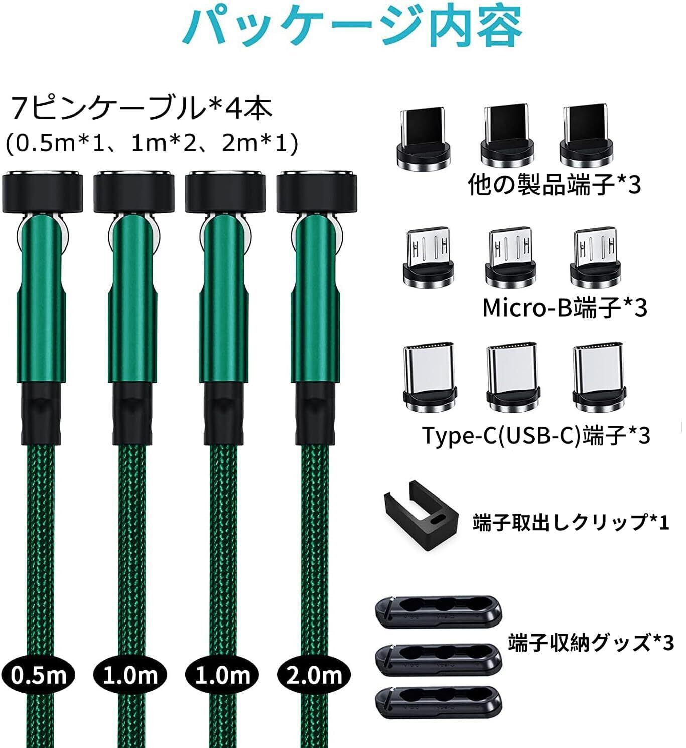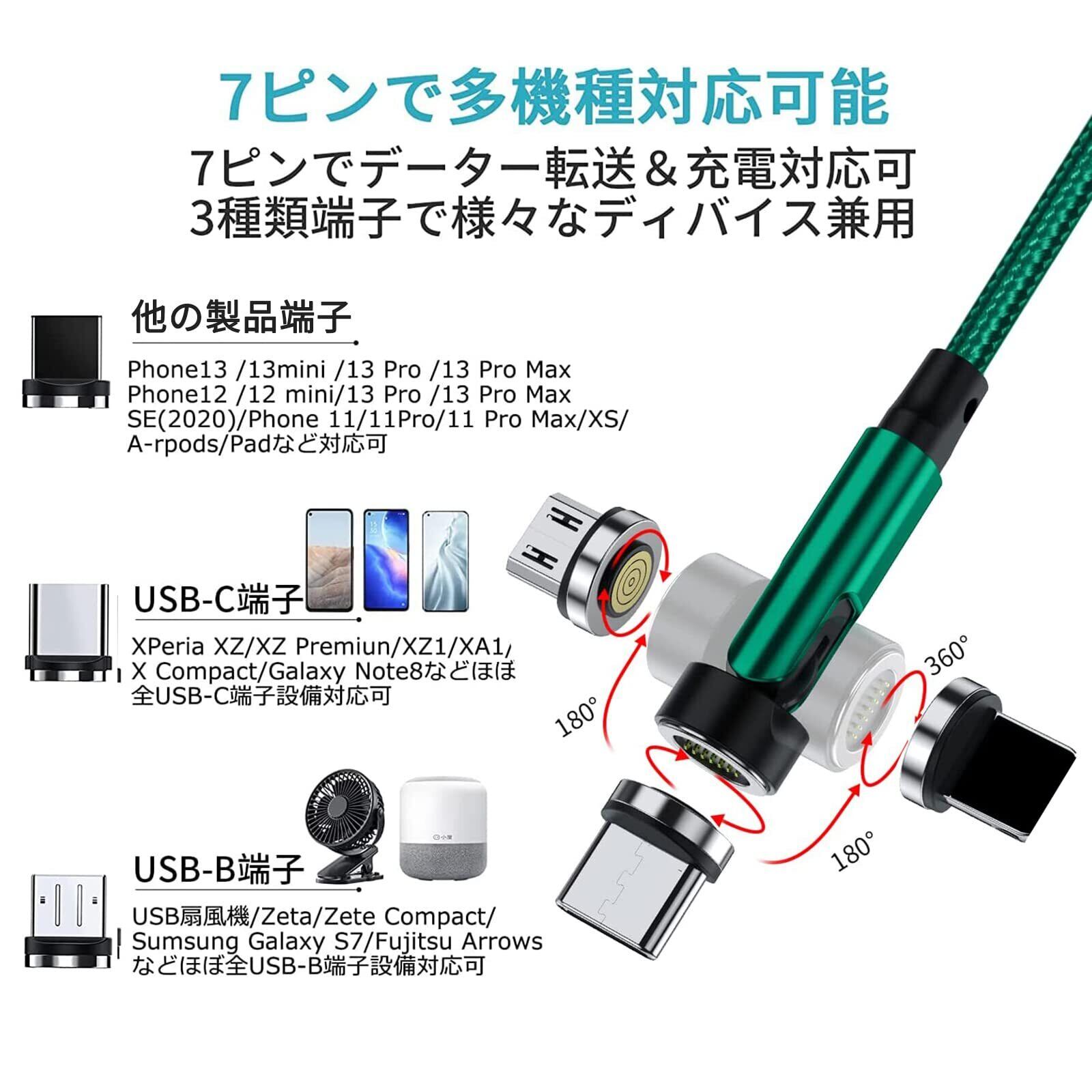 マグネット-充電ケーブル 7ピン 3A急速充電+データ通信 For Phone Type-C-充電ケーブル 3in1 充電コード 【9個端子+ 4本セット】 540度回転 0.5M+1M+1M+2M 磁石 Ligting USB-B ケ ーブル For Pad Air/Pad Pro/For Phone 13 / 12 / 11 / SE/Pixel 片手操作 ダー クグリーン HYDOOD