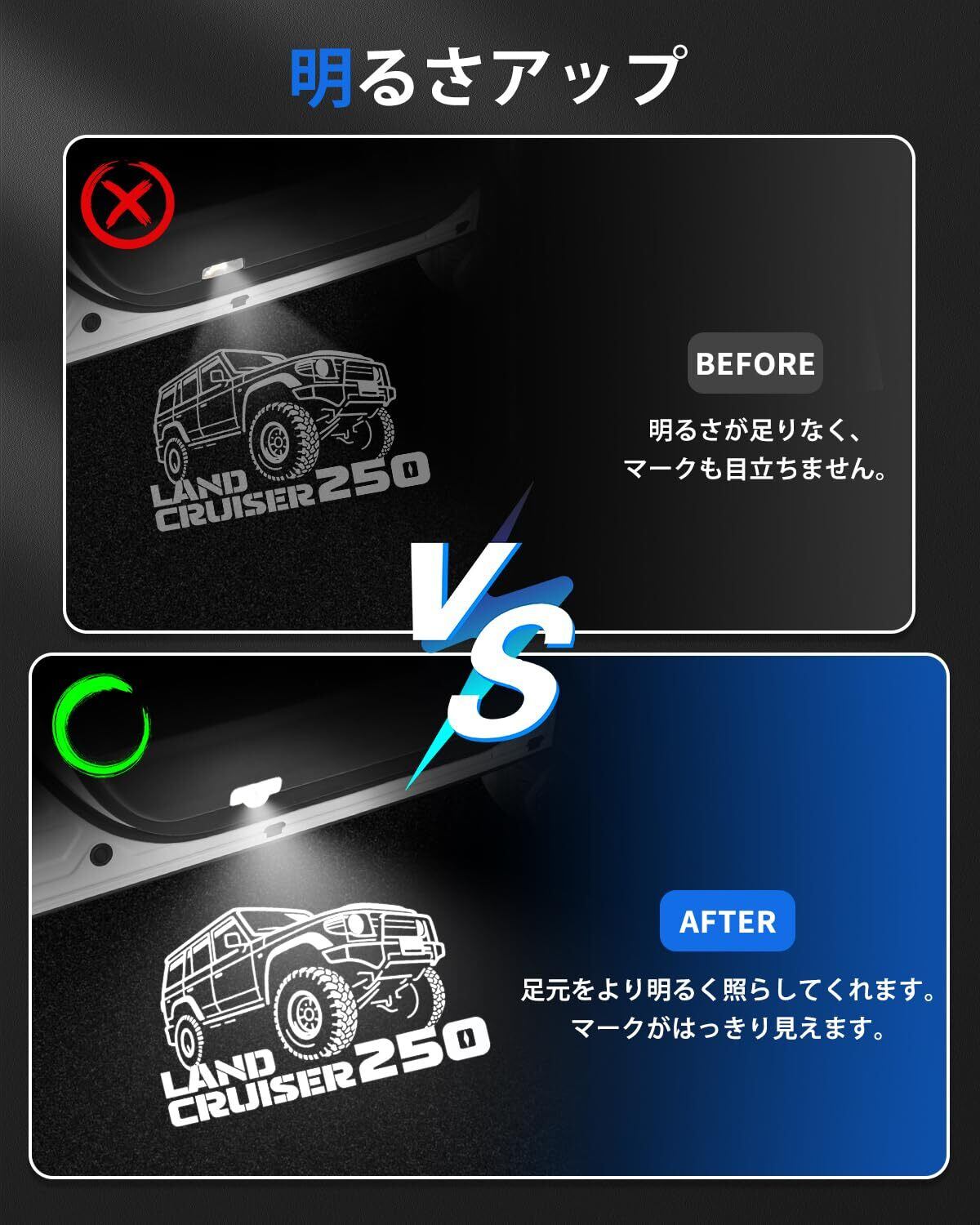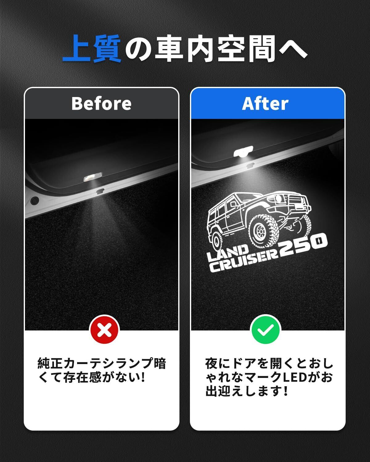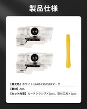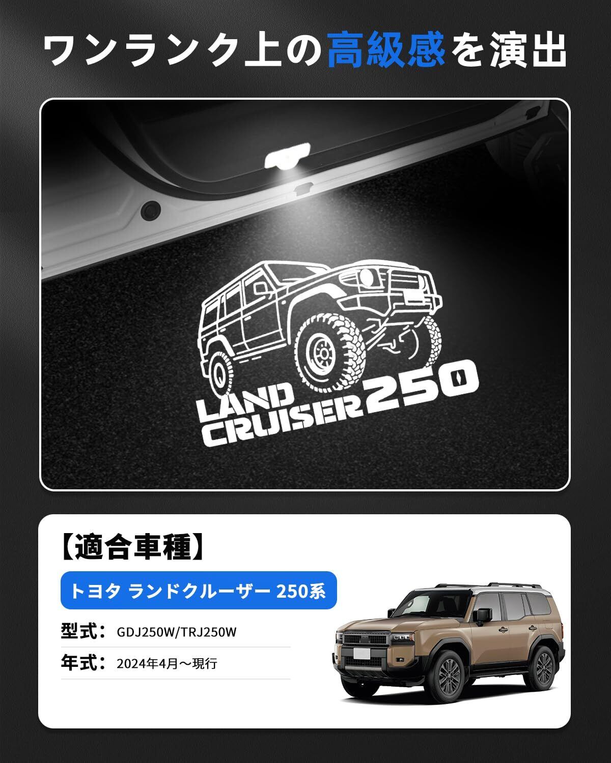 1.【適合車種】トヨタ 新型 ランドクルーザー 250系 5人乗り/7人乗り対応;式:GDJ250W/TRJ250W;年式:2024年4月(令和6年4月)~現行;セット内容:カーテシランプ×2pcs、タイプ1、取付工具×1pcs。※年式・グレード・オプションにより適合しない場合がございます、形状をご確認いただいたうえ、お買い求めください。