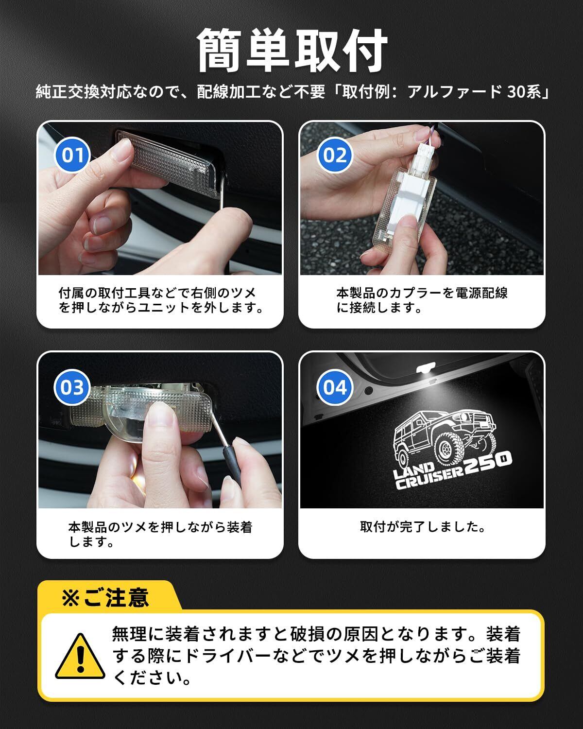 4.【簡単取付】専用設計なので、取付箇所の加工は一切不要で、内張剥がしやドライバーなどで純正カーテシライトを取り外し、カプラーオンで簡単に取り替えます。ご愛車を損なうことなく、素人でもラクラク。