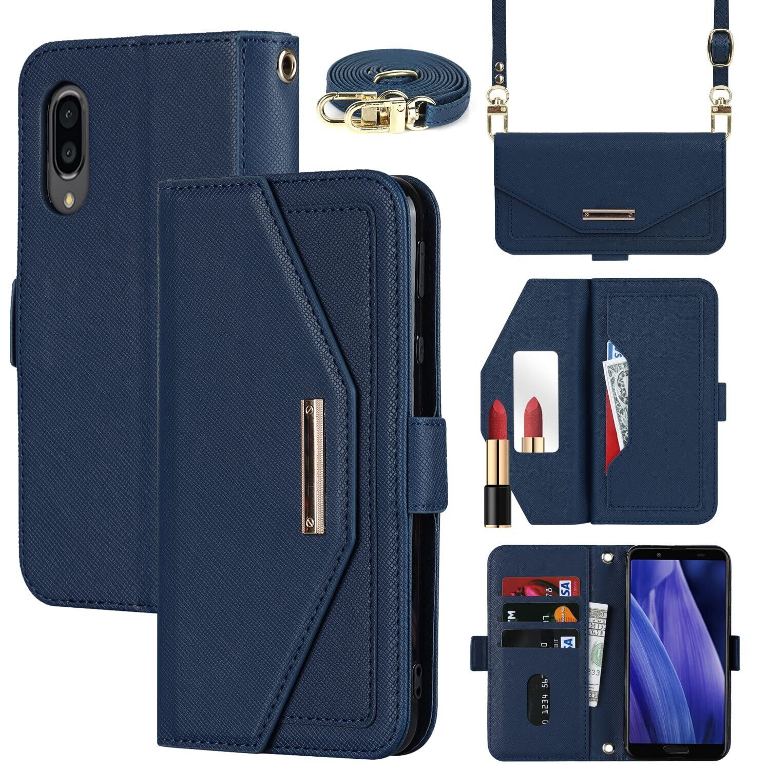 AQUOS Sense3 ケース 手帳型 ショルダー 鏡付きケース 鏡ケース ミラー mirror 鏡 レディース 女性 鏡付き ミラーケース ショルダーケース クロスボディ SH-M12 SIMフリー SH-02M SHV45 ケース / sense3 basic 907SH SHV48 ケース / アクオス Sense3 lite ケース SH-RM12 ケース / シャープ Android One S7 ワイモバイル Android OneS7 ケース センス3 ライト アンドロイド ワン S7 対応 手帳 カバー 適用 スマホケース case 【iCoverCase】 ストラップホール付き 留め具 カード収納 バッグ スタンド ミラー付き 化粧鏡 かがみ 鏡 ストラップ マグネット 肩がけ 首掛け 斜め掛け カードケース ストラップ付き カバー カード入れ スマホケース 携帯カバー ブルー レトロ ネイビー