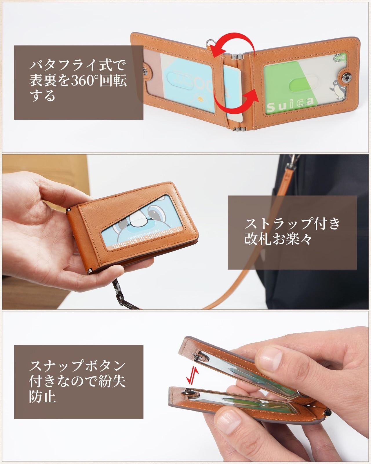 【360°回転&スナップボタン付き】360°回転金具で折り返しもスムーズなので、ストレス無く使えます。バタフライタイプの定期ケース外側の名前部分が隠れる構造であり、個人情報を保護するとともに窓あき部分で何のカードがすぐに判別します。定期ケースの中身も見えないスナップボタンつきでパカパカ開かないし落ちる心配もなく安心して使えます。