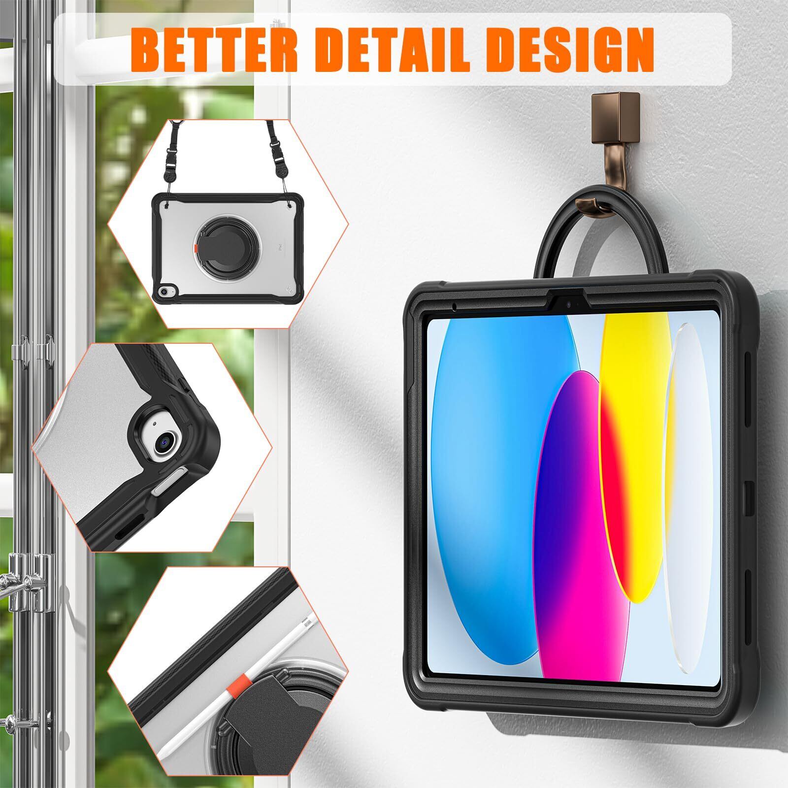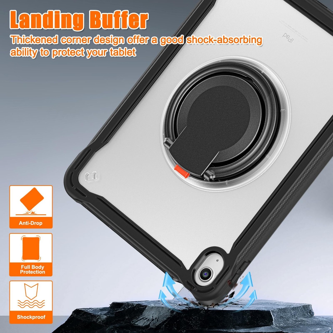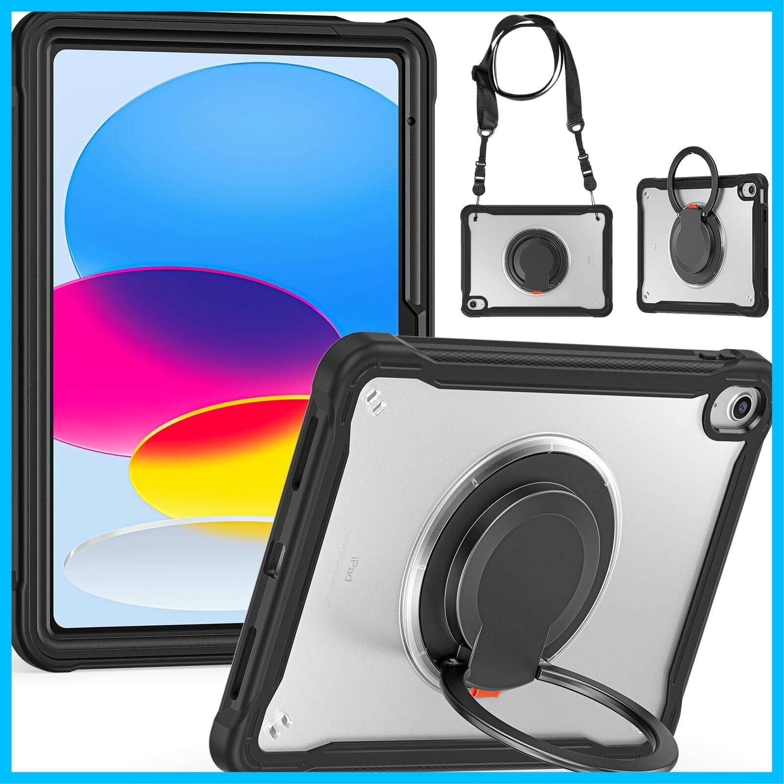 SENLAN iPad 10第10世代 2022/iPad A16 第11世代 2025 用ケース 縦置き 横置き 肩掛け 360°回転持ち手 ペン収納 ショルダーストラップ付き ハードPC +シリコン リングスタンド 耐衝撃 半透明 背面カバー つや消し, 黒