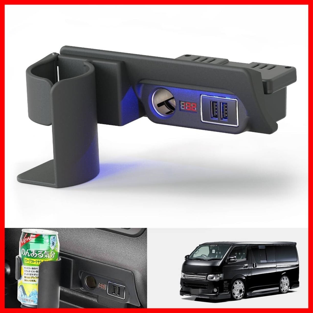「国内企業販売」SUNVIC ハイエース 200系 増設電源ユニット QC3.0 USBポートx2 カーソケットx1 ブルーLED ライト 増設用キット 同時充電 カップホルダー付き