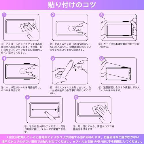 【専用のガイド枠】専用のガイド枠付きで、正確な位置に完璧に貼り付けることができます、保護フィルムの接着面は特殊な自動吸着層を使用しているので、ガラスを液晶に置くだけで自然に吸着し、気泡が出来にくいので、 誰でも簡単、綺麗に貼ることができます。