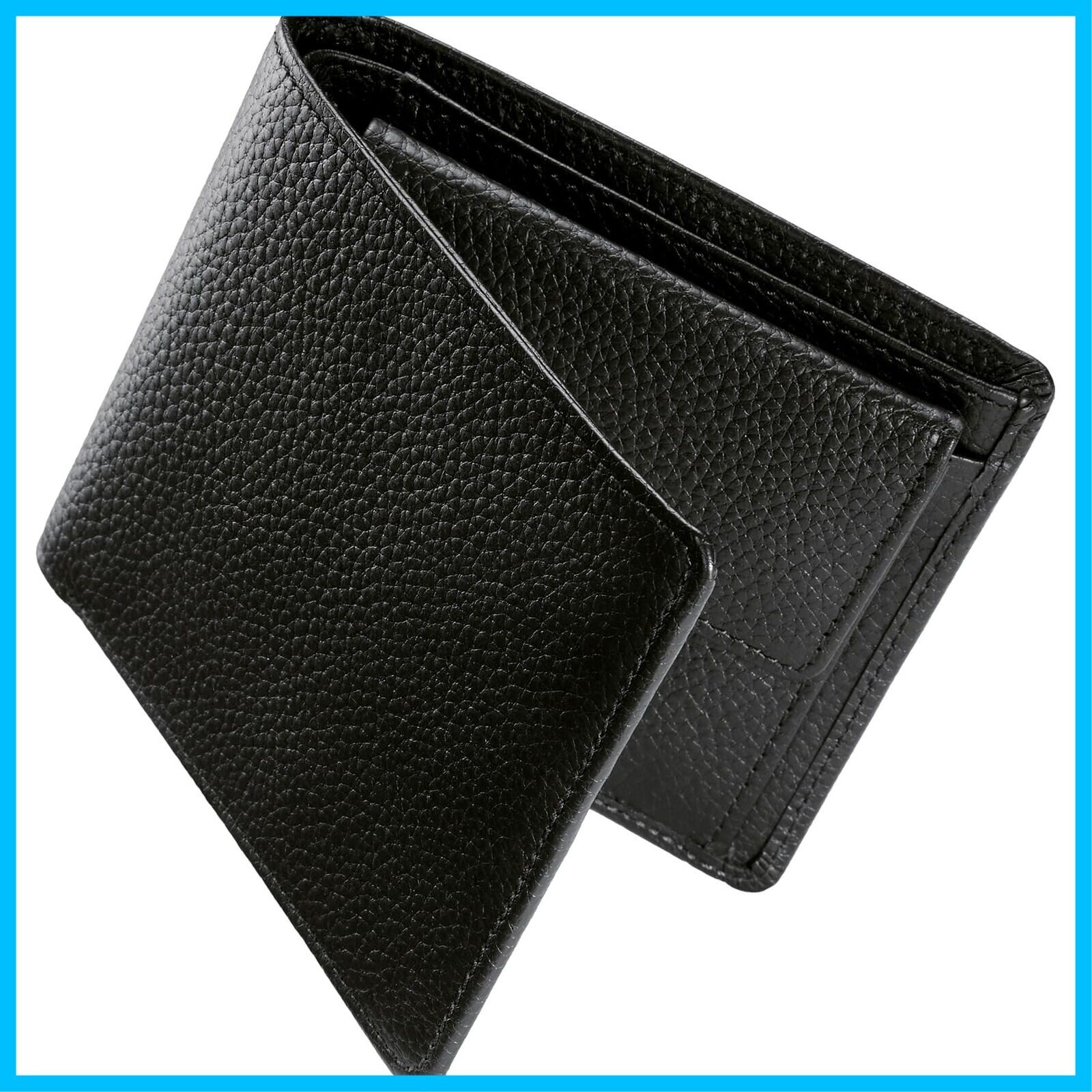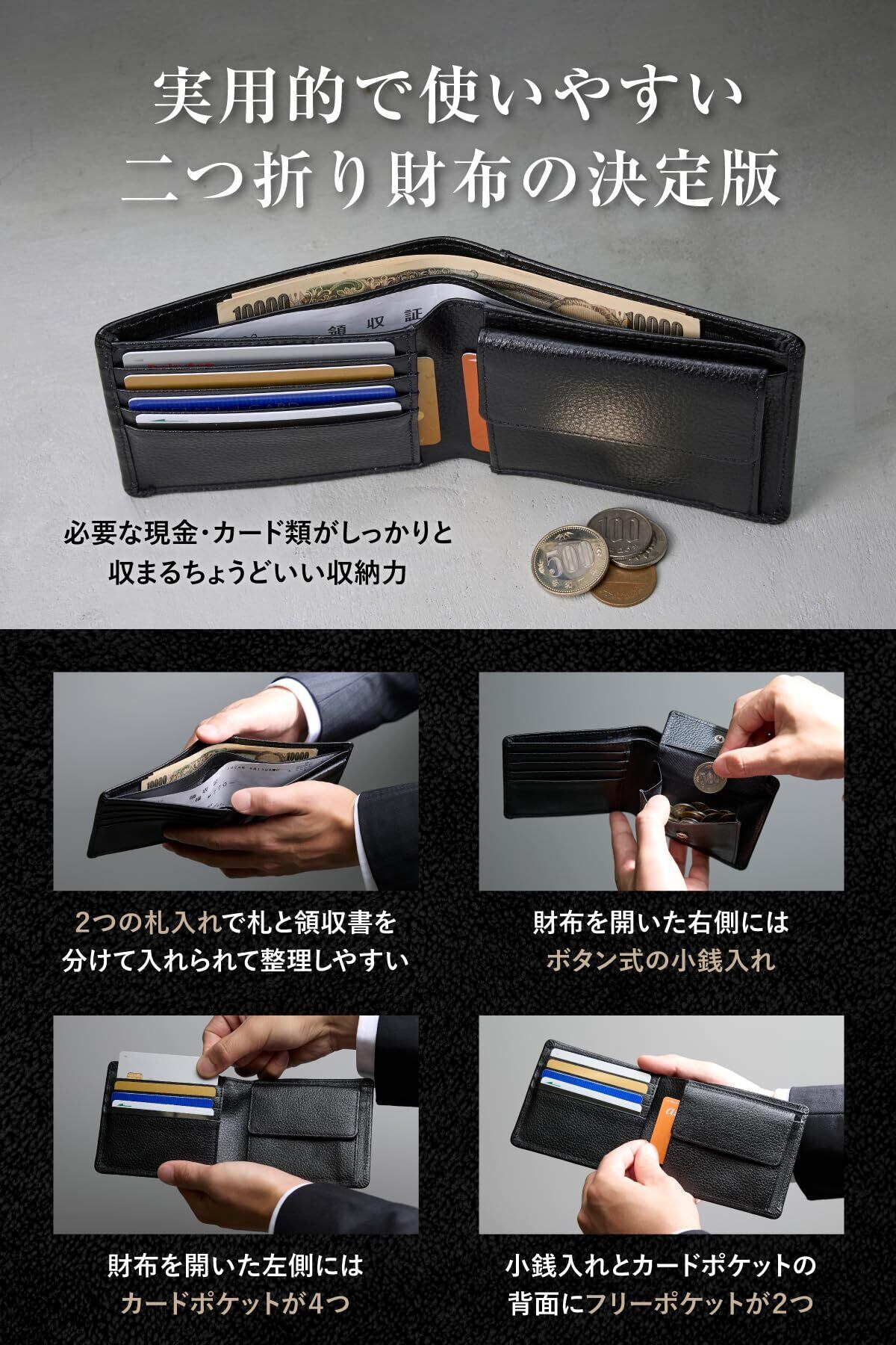 【実用的で使いやすい二つ折り財布の決定版】2つの札入れで札と領収書を分けて入れられて整理しやすいです。財布を開いた右側にはボタン式の小銭入れ、左側にはカードポケットが4つあり、小銭入れとカードポケットの背面にフリーポケットが2つあります。必要な現金・カード類がしっかりと収まるちょうどいい収納力です。