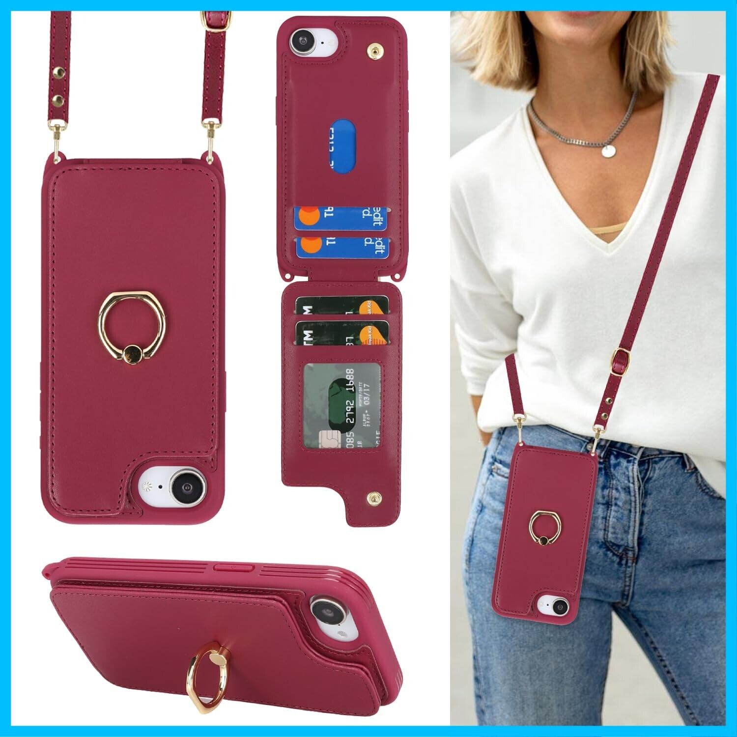 Cavor iPhone 16eと互換性があるケース手帳型iPhone 16e 用のケースショルダーストラップ クロスボディ肩掛け 首かけ 斜めがけ 背面ポケット付き 財布カバー【上下開】ジッパー式 カード収納【RFID機能】case 360°回転リング ストラップ 穴 横置磁気機能 落下防止 盗難 防止持ちやすい-ローズレッド
