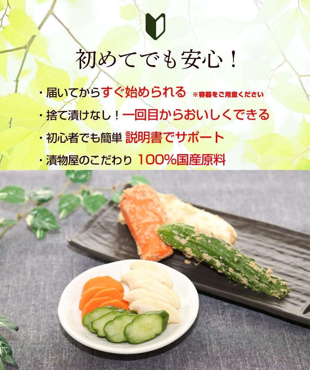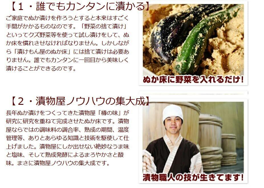 【誰でもカンタンに漬かるぬか床】ご家庭でぬか漬けを作ろうとすると本来はすごく手間がかかるものなのです。「野菜の捨て漬け」といってクズ野菜等を使って試し漬けをして、ぬか床を慣れさせなければなりません。しかしながら「漬けもん屋のぬか床」には捨て漬けは必要ありません。誰でもカンタンに一回目から美味しく漬けることができるのです。 【漬物屋ノウハウの集大成】長年ぬか漬けをつくってきた漬物屋「樽の味」が研究に研究を重ねて完成させたぬか 床です。漬物屋ならではの調味料の調合率、熟成の期間、温度管理等、ありとあらゆる 知識と技術を駆使して仕上げました。