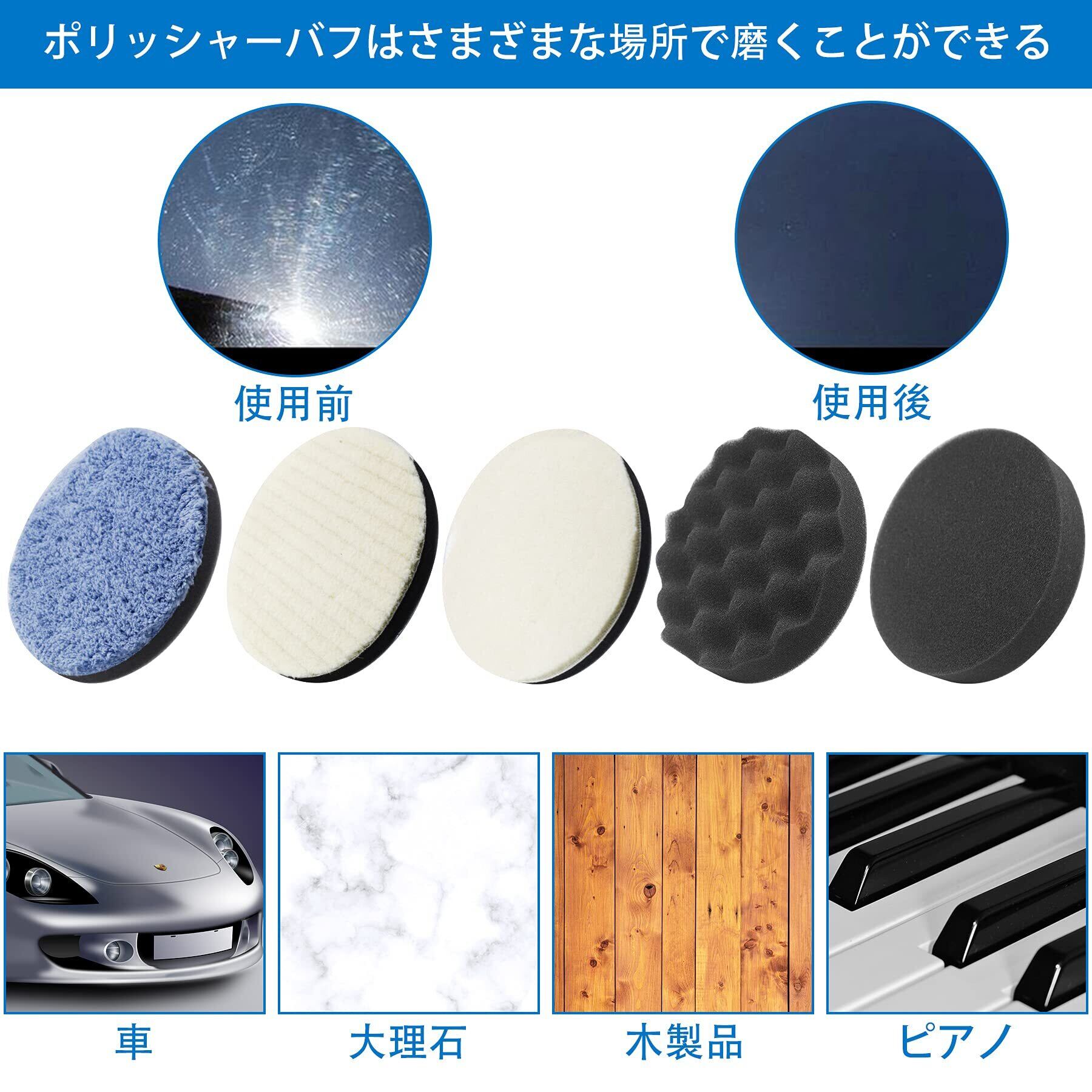 【さまざまなタイプの研磨パッド】粗目ウールバフは車、床、木製品などの汚れを取り除き、ワックスを拭き取りに適合します。 細目ウールバフは上塗り仕上げの研磨、家具、プラスチック、ガラス、石の研磨、拭き取りに適合します。マイクロファイバーの高速仕上げパッドは、ワックスを取り除くのに最適です。 当社の研磨用スポンジは柔らかいスポンジ素材を使用しており、超弾性、超靭性、強い吸水性を持っています。