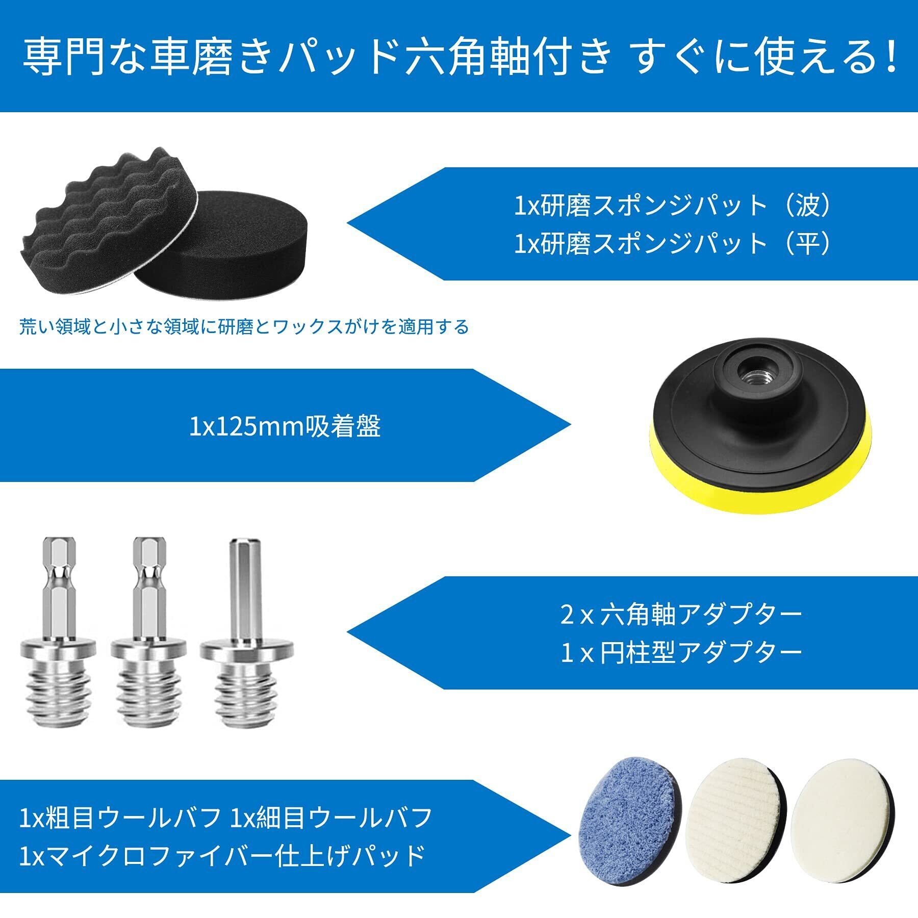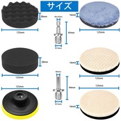 【梱包内容】1x粗目ウールバフ 、1x細目ウールバフ、1xマイクロファイバー仕上げパッド、1x平型スポンジ、1x波型スポンジ、1x吸着盤、2x六角軸アダプター、1x円柱型アダプターを含みます。ご注意:・スポンジ部分をはがす場合は、マジックテープ部分を掴みゆっくりと剥がして下さい。 ・スポンジを水洗いする際は、本体から先に剥がした後に洗浄して下さい。