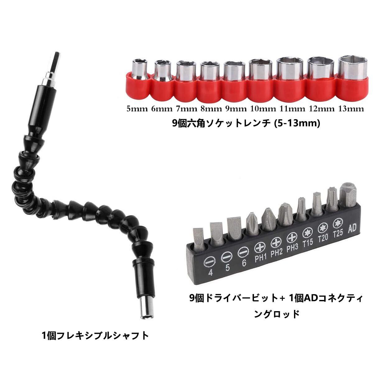 セット内容:フレキシブルシャフト300mm1本、9個六角ソケットレンチ (5-13mm)、9種類のドライバービット、ADコネクティングロッド1本を含む多機能工具セット。作業効率を高める充実の内容です