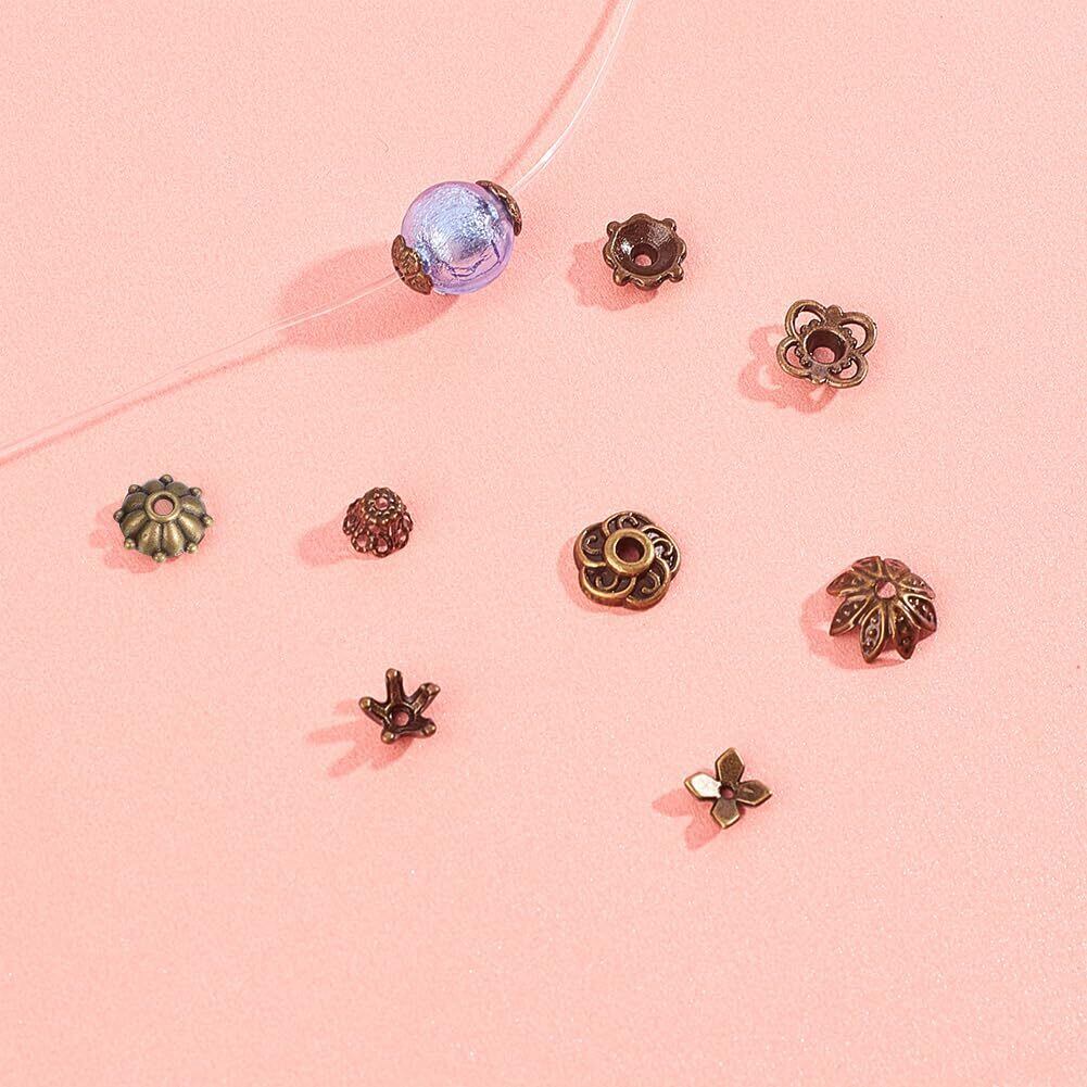 【240個12種ビーズキャップ】:銅色ビーズキャップは全部で12種の異なるデザインがあり、毎種のデザインは異なる感じがあります。全部で240個あります。数が非常に多く、大量のビーズキャップを必要とするお客様に最適です。