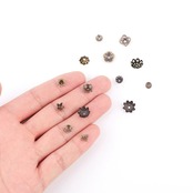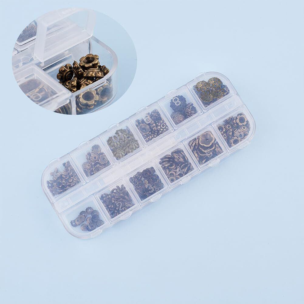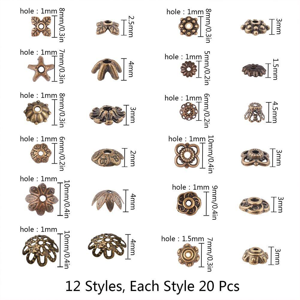 【サイズと数量】:銅色ビーズキャップ*240個12種:各20個で、合計240個です。最大のは透かし彫りの花ビーズキャップ:10x4mm、穴: 1mmで、最小のは花ビーズキャップ:5x1.5mmです。収納ケース*1つ:13x5x1.5cm。