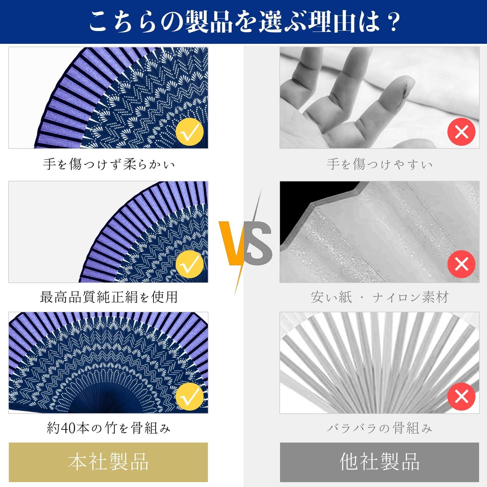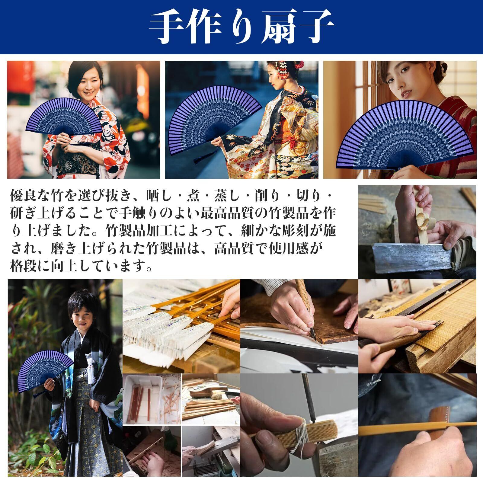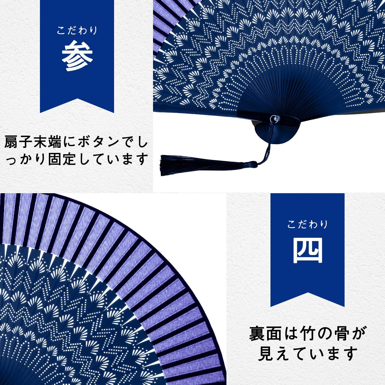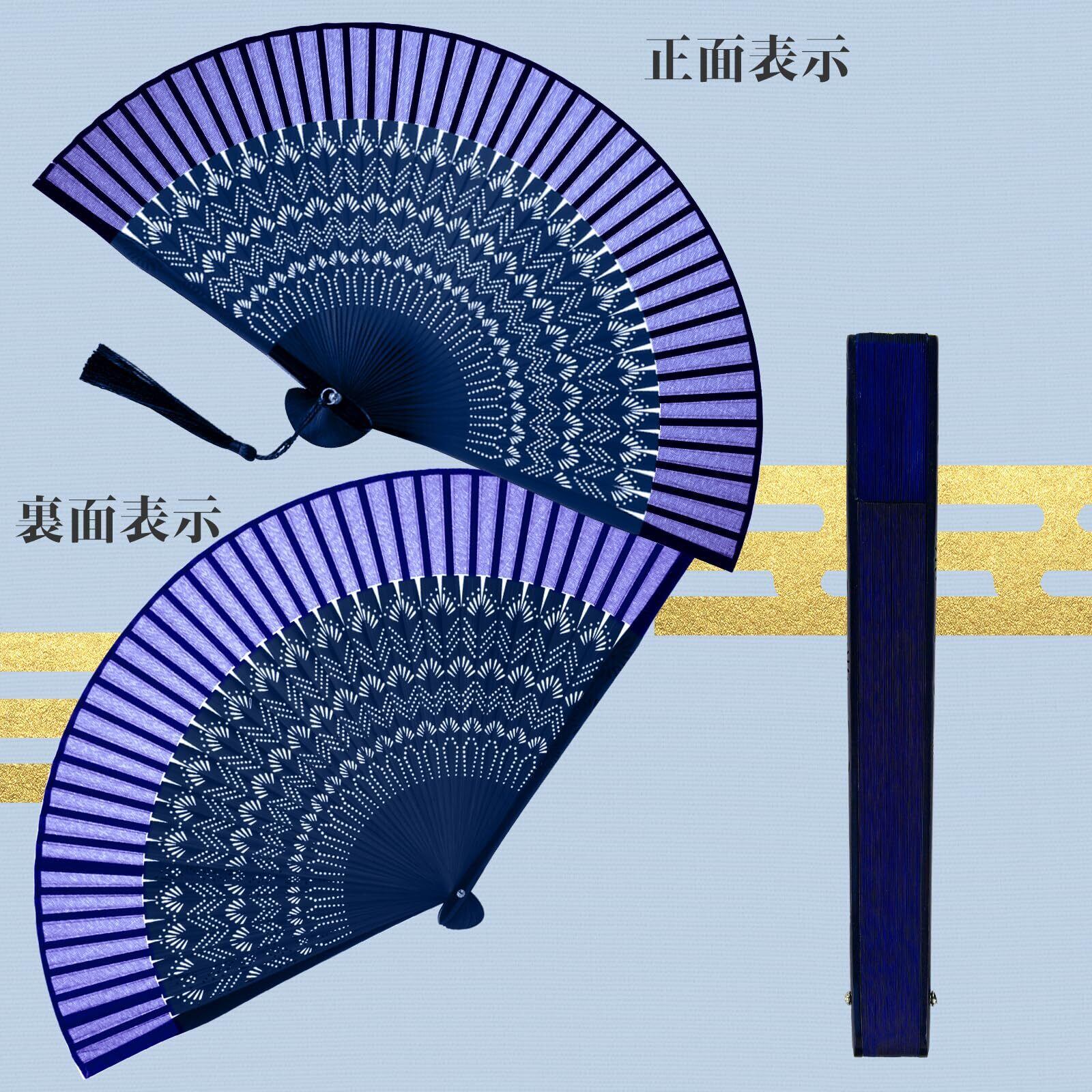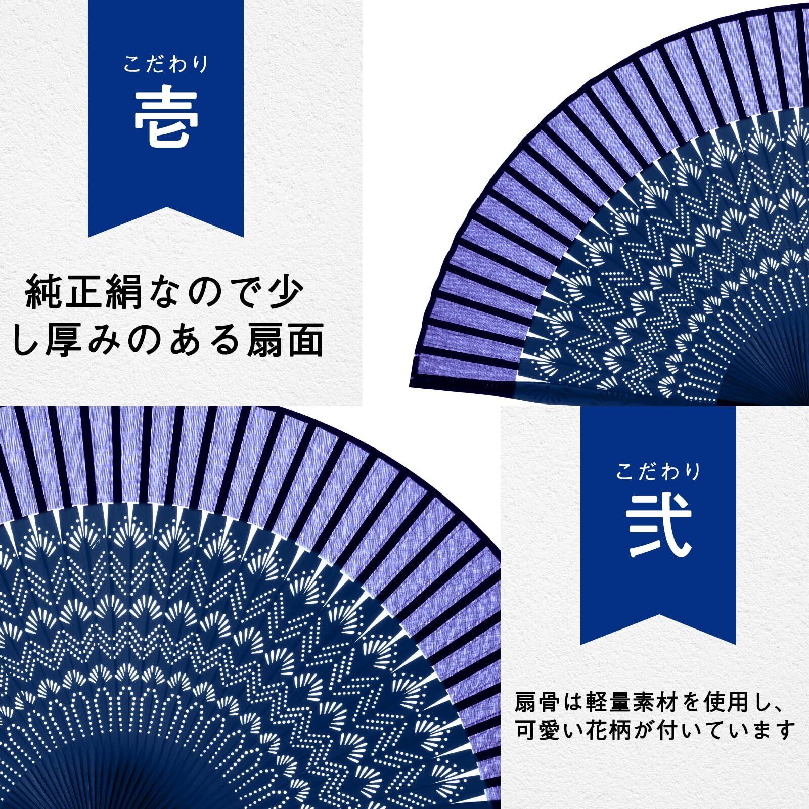 【素材】扇骨には青竹を使用し、扇面には本物の絹生地を使っています。これにより、扇子は高品質でありながら、自然な美しさと繊細さを兼ね備えています。頑丈な青竹の扇骨は軽くて丈夫であり、長時間の使用でも疲れにくいです。