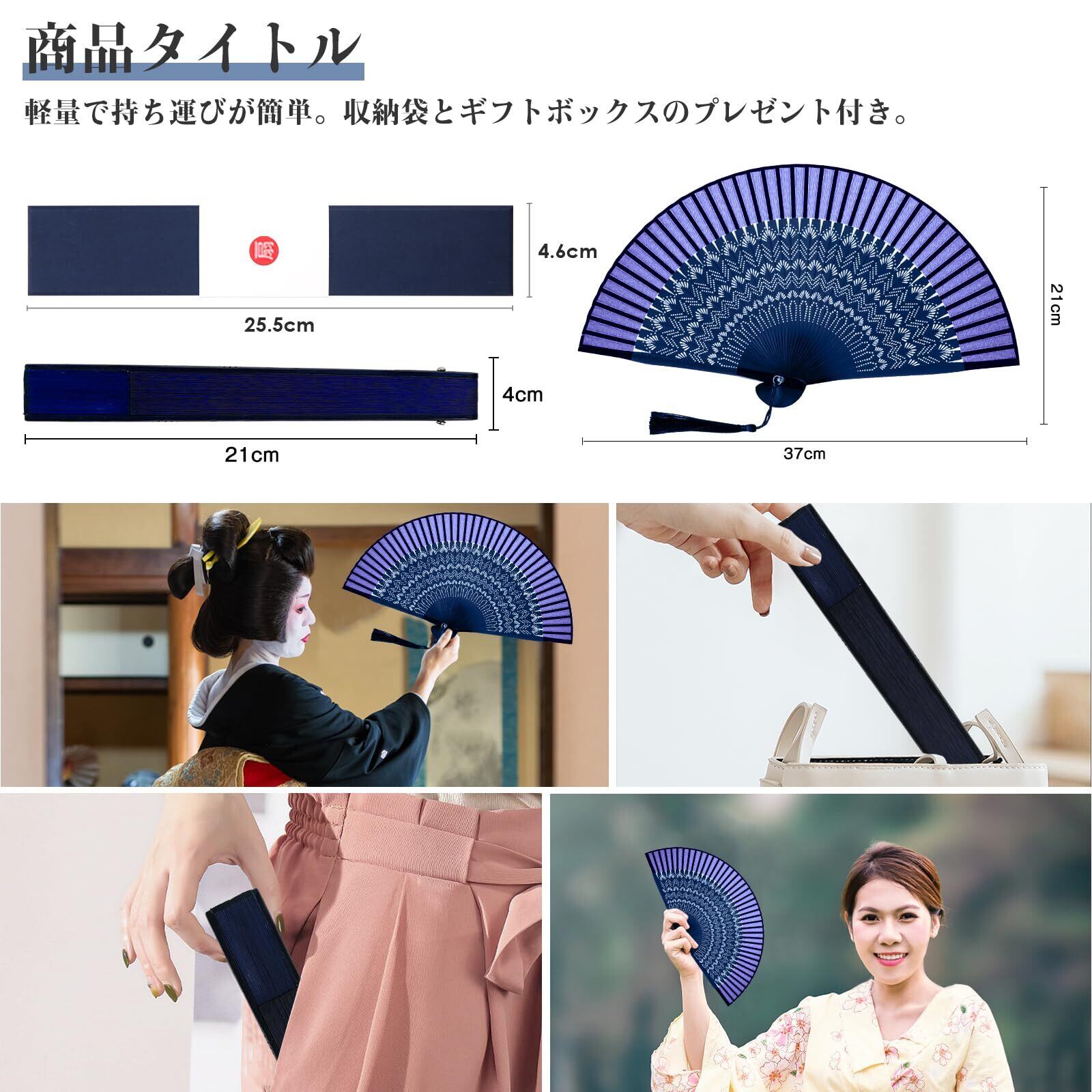 【軽くて持ち運びやすい】本扇子は折りたたみ式でコンパクト、短くて35gだけで、着物や浴衣などの帯に挿すとか鞄に入れるとか邪魔にならなくて持ち運びやすいです。扇子を保護し、携帯に便利な収納袋が付属します。