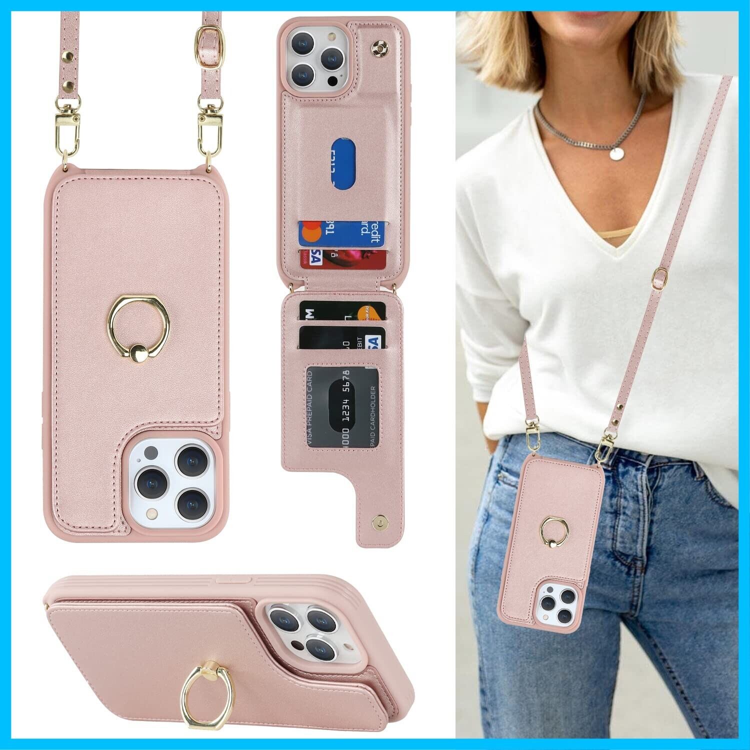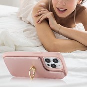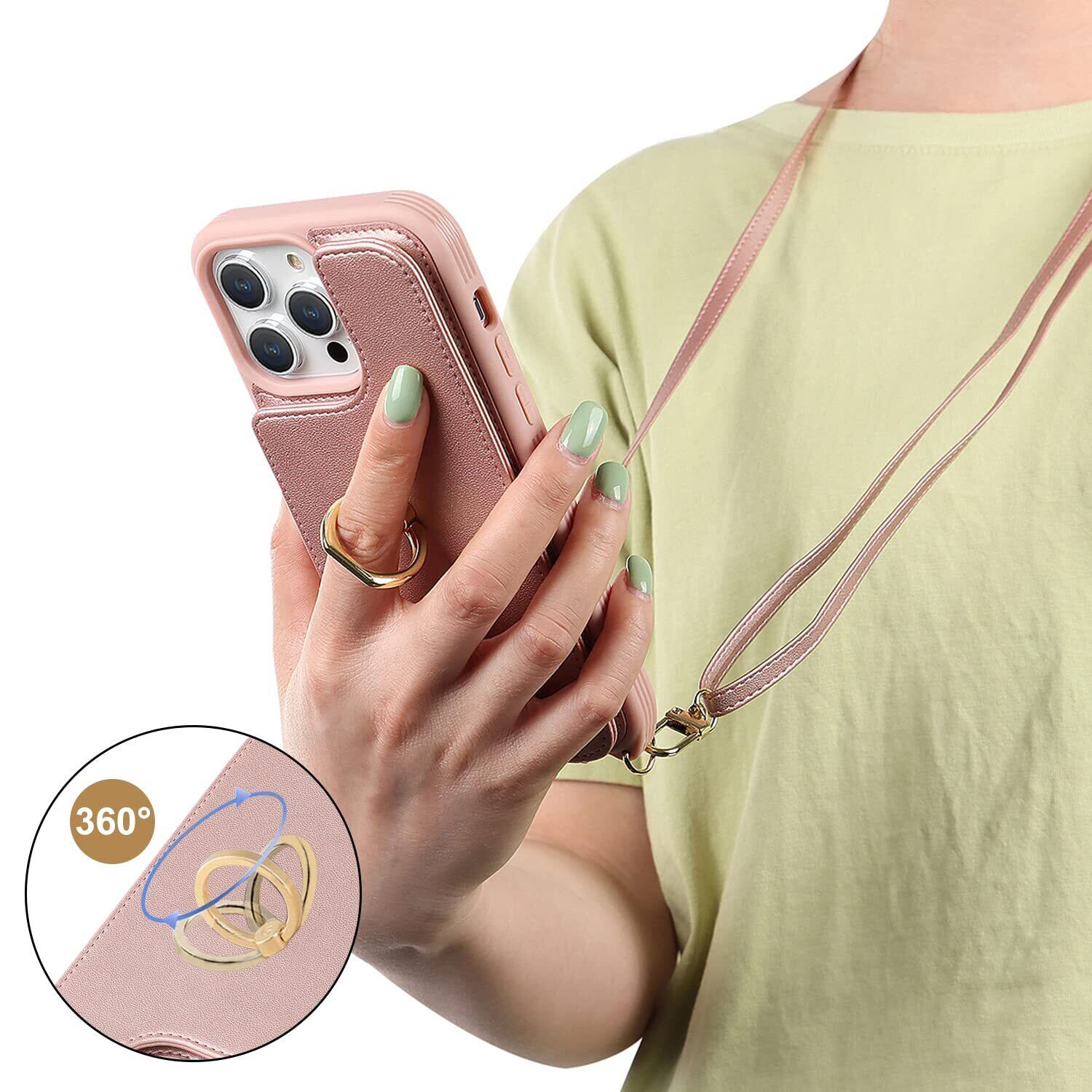 Cavor iPhone15 Pro と互換性があるケース手帳型iPhone15 Pro 用のケースショルダーストラップ クロスボディ肩掛け 首かけ 斜めがけショルダーストラップ 背面ポケット付き【上下開】ジッパー式 カード収納【RFID機能】case カード収納 360°回転リング落下防止/持ちやすい横置磁気機能-ピンク