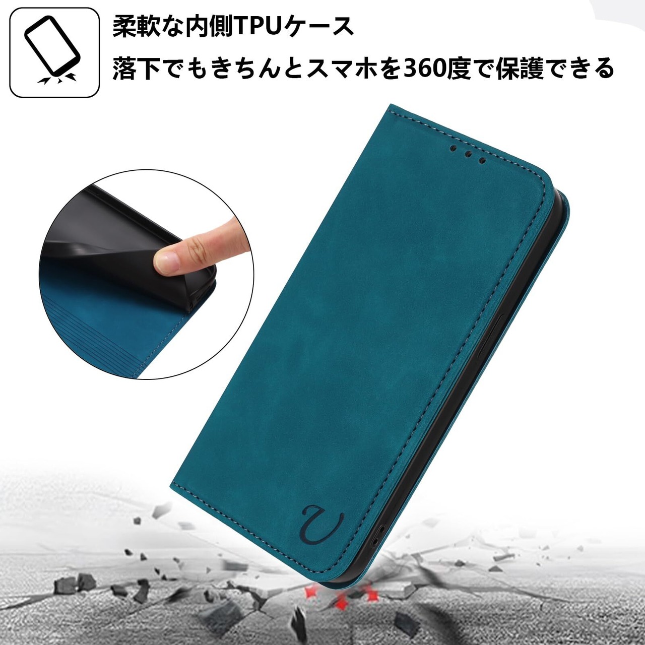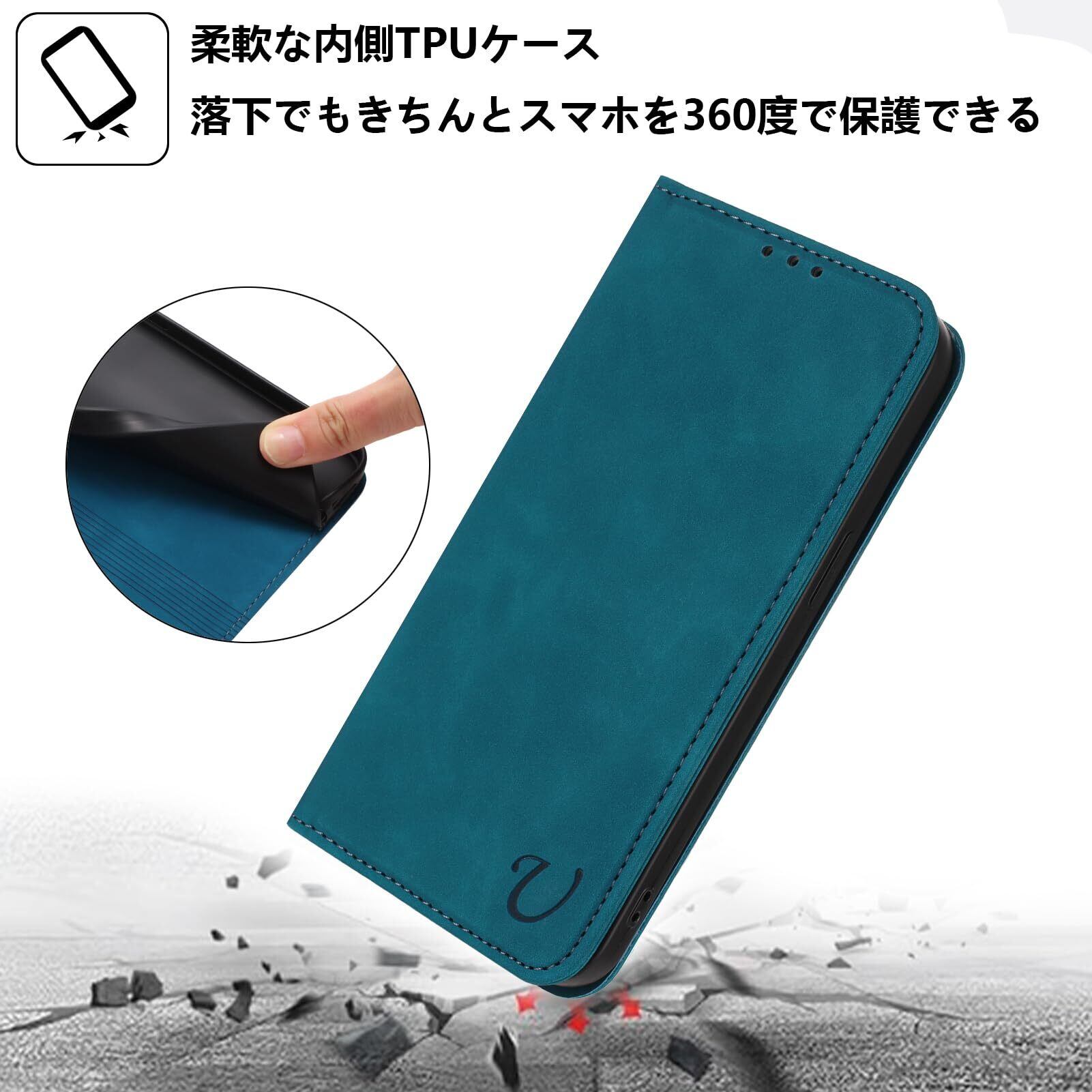 【マグネット内蔵 全面保護】マグネット内蔵の手帳型式で、カバーを閉める時、片手で簡易に開閉することはできます。外側は高品質のPU製で、落下時の衝撃を効果的に吸収してスマホへの直接的な外力を防げるようになっています。内側は柔軟性あるTPUケースで、二重の保護として機能します。破損することはありません、衝撃から本体を各方向で360°保護します。