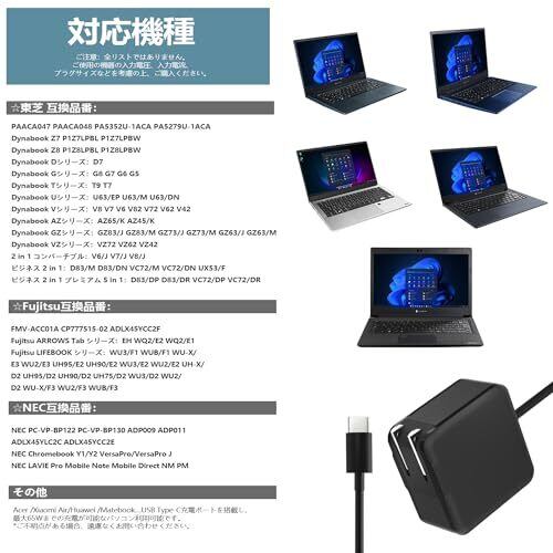 【対応機種(抜粋)/対応dynabook 充電器 Type-C】Dynabook:Z7 P1Z7LPBL/P1Z7LPBW、Z8 P1Z8LPBL/P1Z8LPBW、D7、G8/G7/G6/G5、T9/T7、U63/EP/U63/M/U63/DN、V8/V7/V6/V82/V72/V62/V42、AZ65/K/AZ45/K、GZ83/J/GZ83/M/GZ73/J/GZ73/M/GZ63/J/GZ63/M、VZ72/VZ62/VZ42、V6/J/V7/J/V8/J、D83/M/D83/DN/D83/DP/D83/DR、VC72/M/VC72/DN/VC72/DP/VC72/DR。Fujitsu ARROWS Tab:EH、WQ2/E2、WQ2/E1。Fujitsu LIFEBOOK:WU3/F1、WUB/F1、WU-X/E3、WU2/E3、UH95/E2、UH90/E2、WU3/E2、WU2/E2、UH-X/D2、UH95/D2、UH90/D2、UH75/D2、WU3/D2、WU2/D2、WU-X/F3、WU2/F3、WUB/F3。NEC:Chromebook Y1/Y2、VersaPro/VersaPro J、LAVIE Pro Mobile/Note Mobile/Direct NM/PM。お使いのPCがUSB Type-C給電に対応し、必要電力が45Wまたは65Wであれば、本パソコン充電器 Type-Cで充電できます。