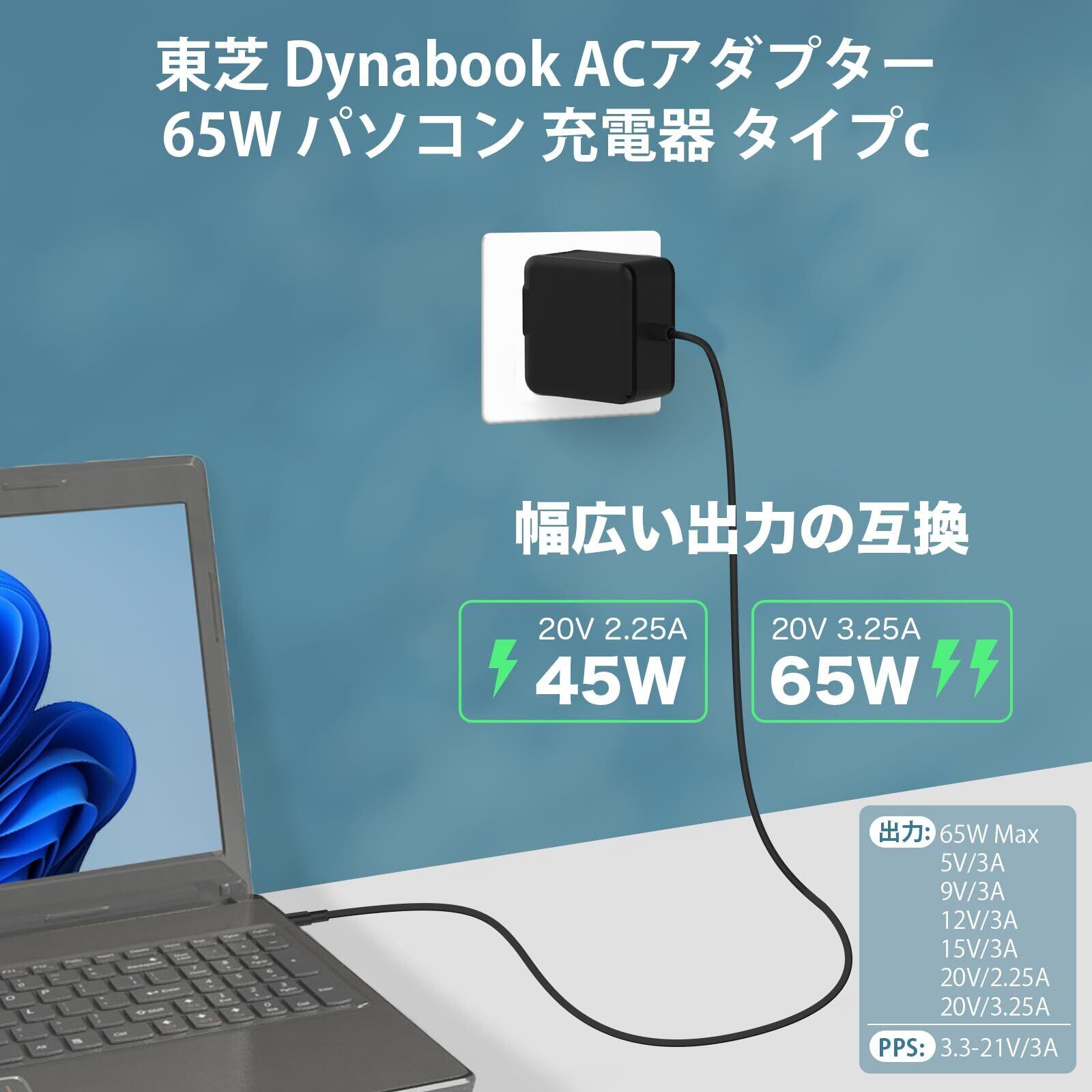 【互換ダイナブック ACアダプターの仕様】本Dynabook ACアダプターは純正品ではありません。互換品/予備用のダイナブック acアダプター 65Wです。入力:100–240V 50/60Hz 1.5A。出力:5V 3A/9V 3A/12V 3A/15V 3A/20V 3.25A(最大65W)。PPS:3.3–21V=3A。USB PD準拠で、ノートPCを安定かつ高速に充電します。dynabook ノートPCはもちろん、USB Type-Cポート搭載のタブレット・スマートフォン・ゲーム機などにも給電/充電できます。65Wまでの出力に対応し、各電圧プロファイルに下位互換のため、幅広い機器に安全に対応します。