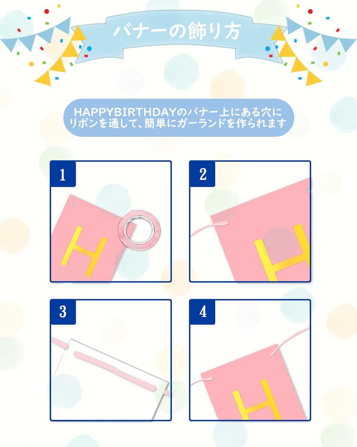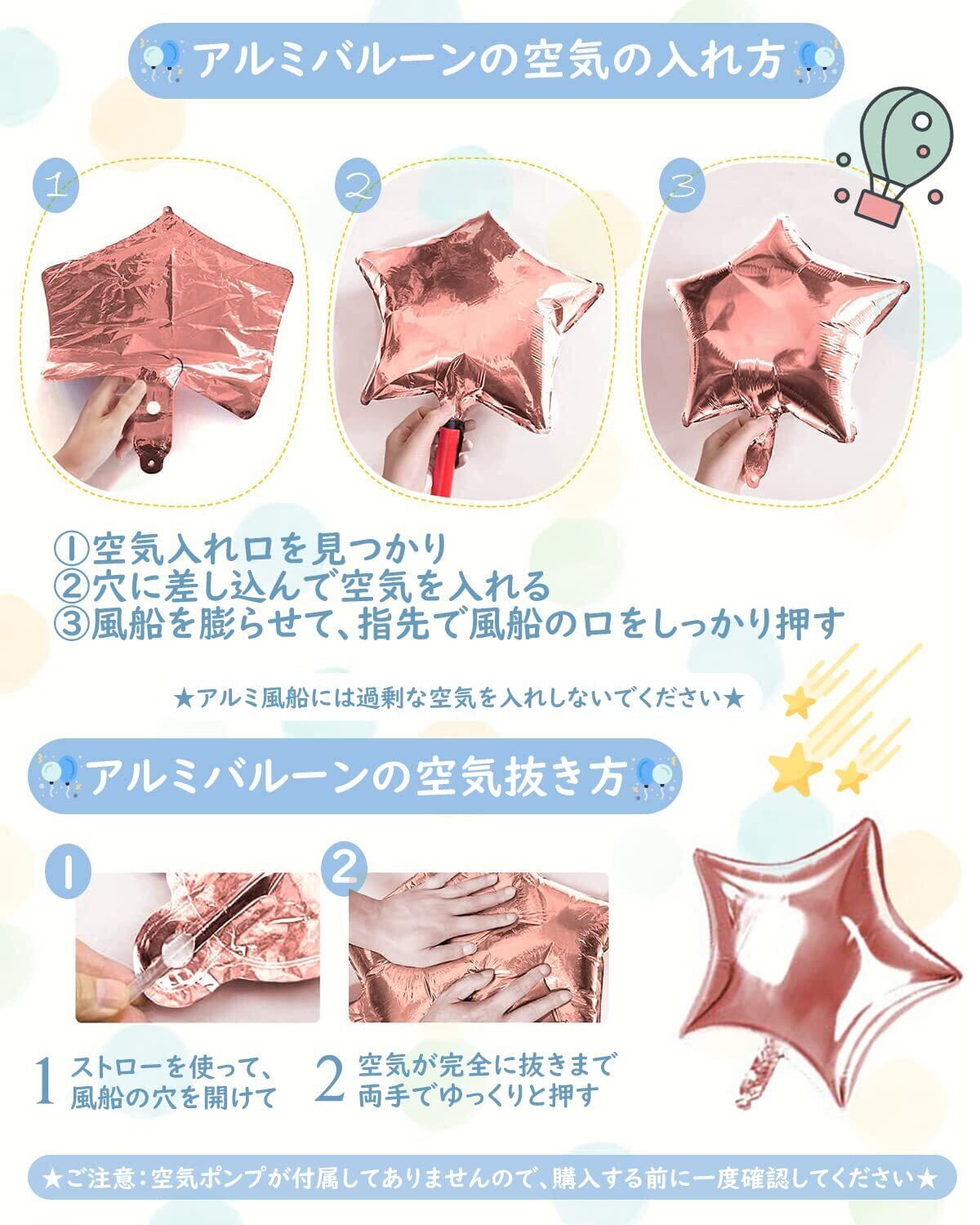 ご注意事項:本製品は装飾品となっております. 6歳未満のお子様が口にしないよう細心の注意をお願い致します. 風船に空気を入れる際は、破れないように少しずつ空気を入れてください. 特に、アルミ風船は空気を入れすぎると破裂してしまうこともあります. 指で押して、少し凹むくらいがベストです. 入荷時期により多少形や色合いが異なる場合がございますのでご了承ください. 結びリボンと壁貼り両面シールは混じて使ってください. 部屋にバルーンを貼る場所がない場合はリボンで室内の壁や窓、または庭に掛けることができます. とても便利です. 誕生日の後、 壁にダメージを与えますので、できる限りリボンを使用することをお勧め致します. リボンは長くて操作も簡単です