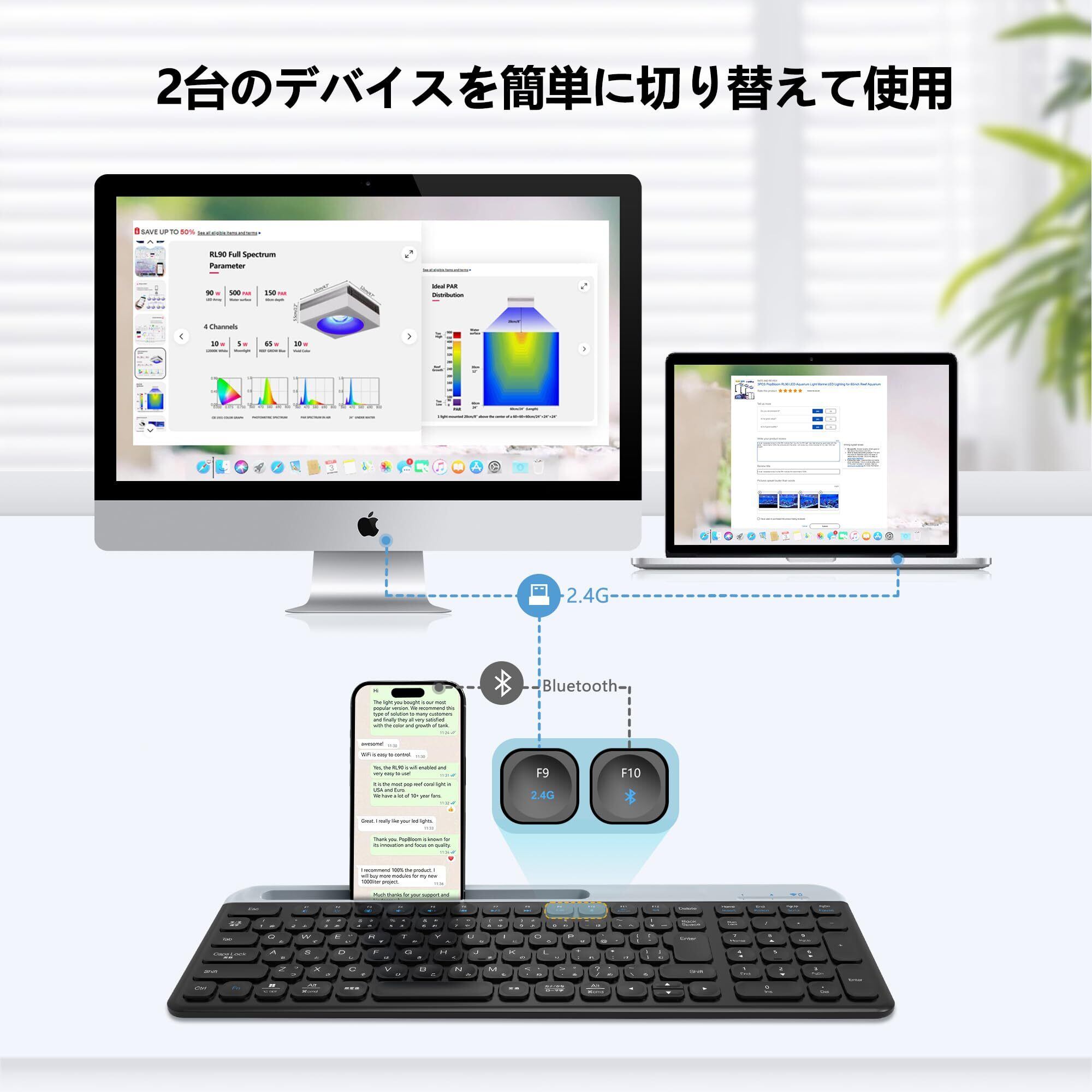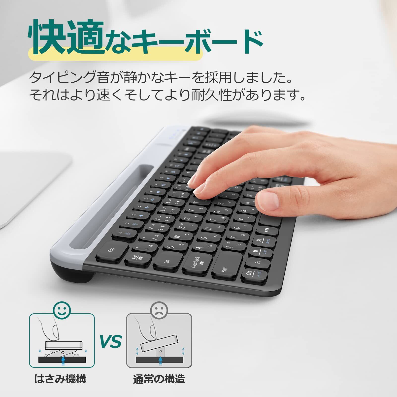 【幅広い互換性】Windows XP、Vista、Win 7、Win 8、Win 10及びMacと互換性があります。 PC、デスクトップ、およびラップトップで操作できます。最先端Bluetooth 5.1を採用しており、従来の製品と比べて転送速度や範囲が飛躍的に向上し、よりスムーズなタイピングを行うことが可能になりました。2.4GHzワイヤレステクノロジーにより、近周波数の電波が多く存在する環境でも、遅延やデータ欠落、干渉のない、安定した通信で快適に操作出来ます。