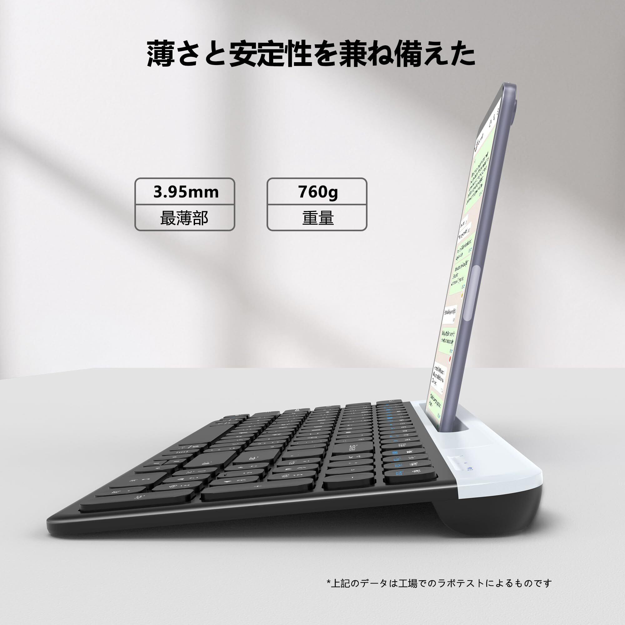 【超薄型・静音ワイヤレスキーボード】ロープロファイルの静音キーを採用/テンキーを搭載しコンパクトながらも高い生産性を実現,キーボード上部にスマートフォンを立てられるフォルダー(溝)付き/パソコンのような作業環境でタイピング