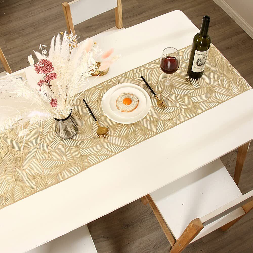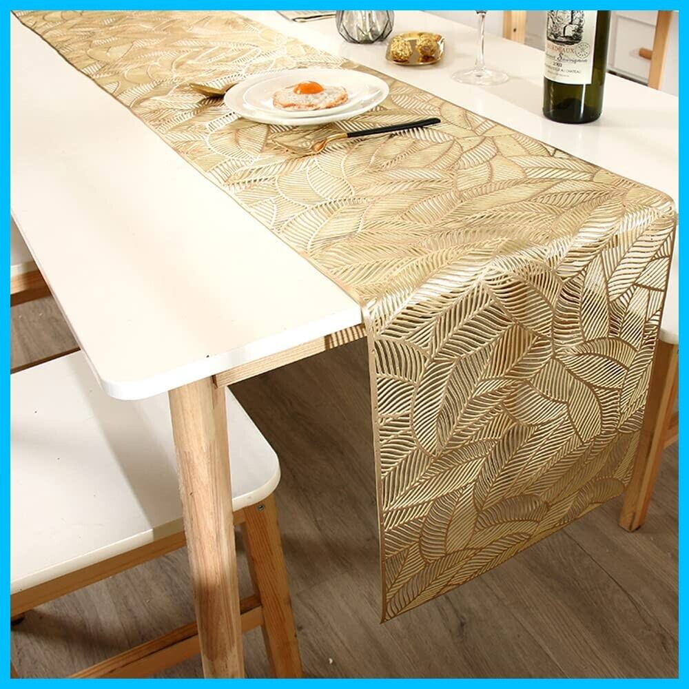 Socpuro テーブルランナー 金色 35*180cm テーブルカバー 華やか PVC 防水 防汚 食卓飾り 北欧 食卓 マット 断熱 滑り止め 透かし彫り ゴールド テーブル 飾り おしゃれ ビニール テーブルクロス 35*180cm クリスマス 結婚式 テーブル装飾 (葉の柄)