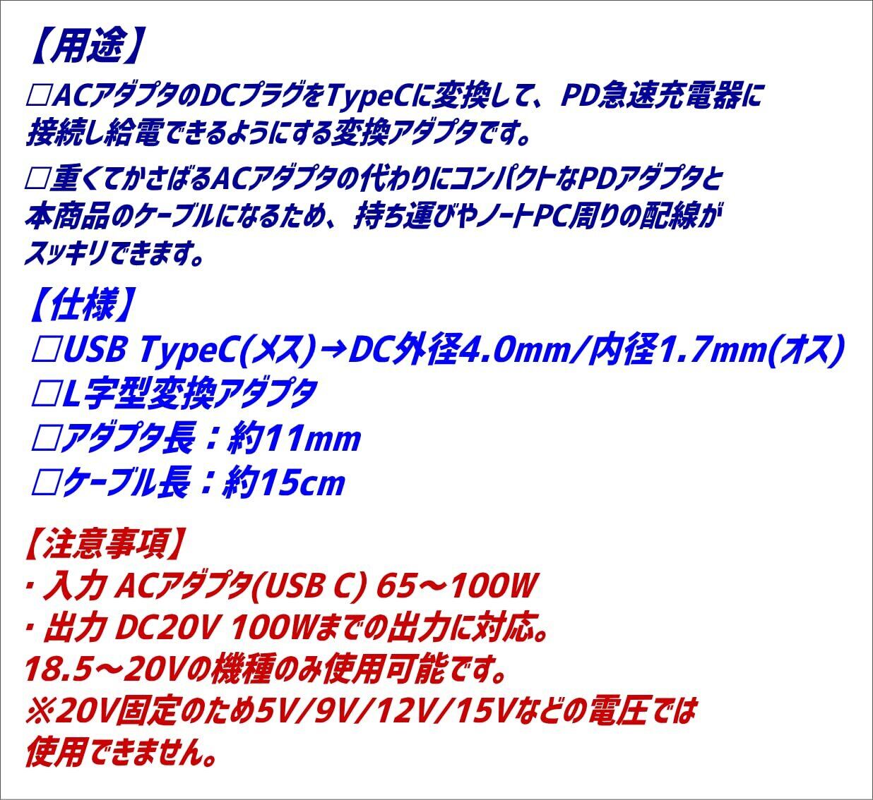 【仕様】 ■数量:1本 ■USB TypeC(メス)→DC(外径4.0/内径1.7mm)(オス) ■ケーブル長:約15cm ■電極:センタープラス ■ケーブル素材:PVC ■対応電圧: ・入力 ACアダプタ (USB C) 65W~100W ・出力 DC20v max.100Wの出力可能 18.5~20Vの機器のみ使用可能