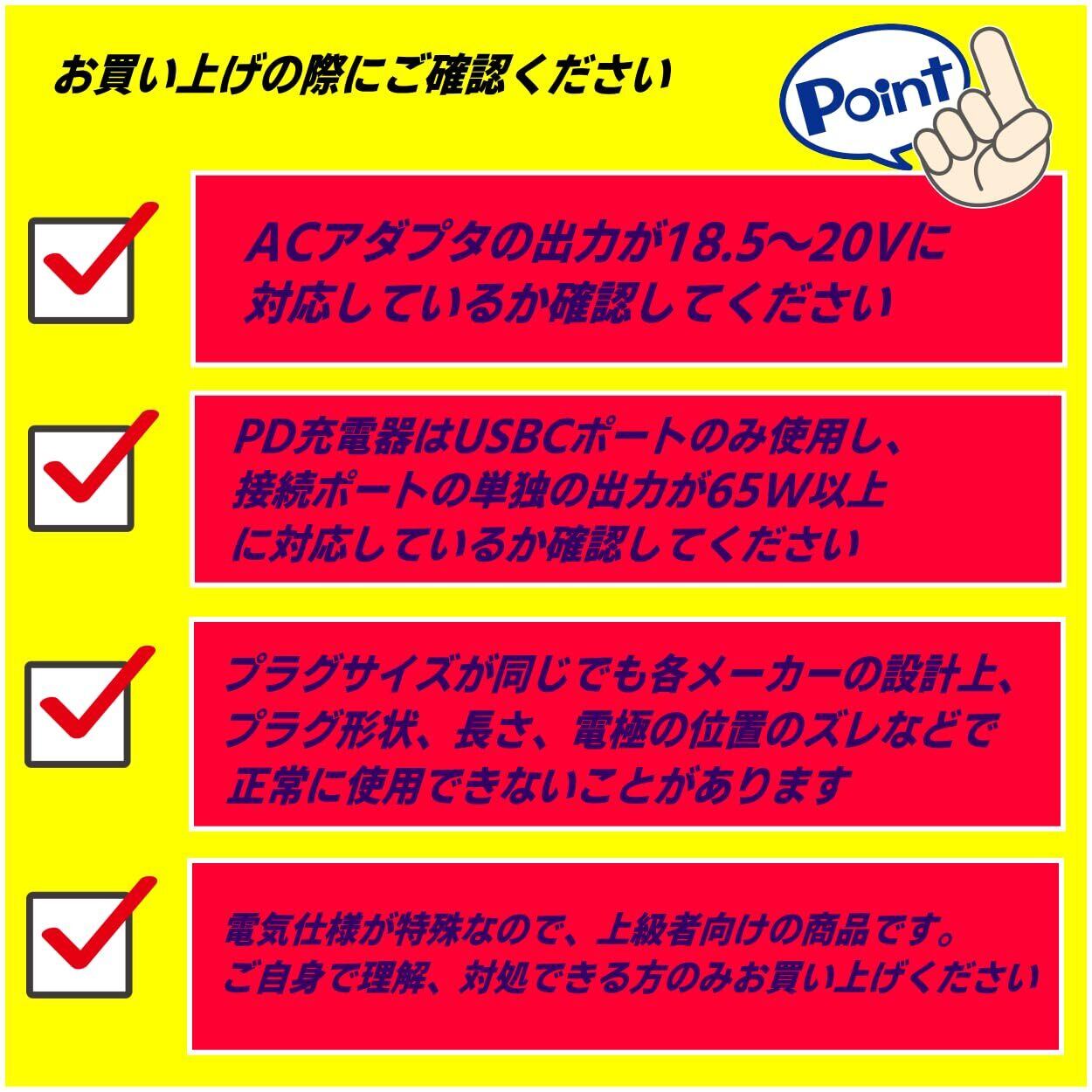 【注意事項】 ※トラブルの多くがPD充電器の出力が「パソコンの要求電力を満たしていない」という現象のようです。PD機器の仕様を必ずご確認ください ※20V出力のため 5v/9v/12v/15vは使用できません ※本製品は汎用プラグです。全ての機器に対応するものではありません ※外径・内径だけでなく、プラグの長さによっては接続できない事があります ※本品は電気仕様を理解できる上級者向けの商品です。ご自身で理解、対処できる方のみご検討ください
