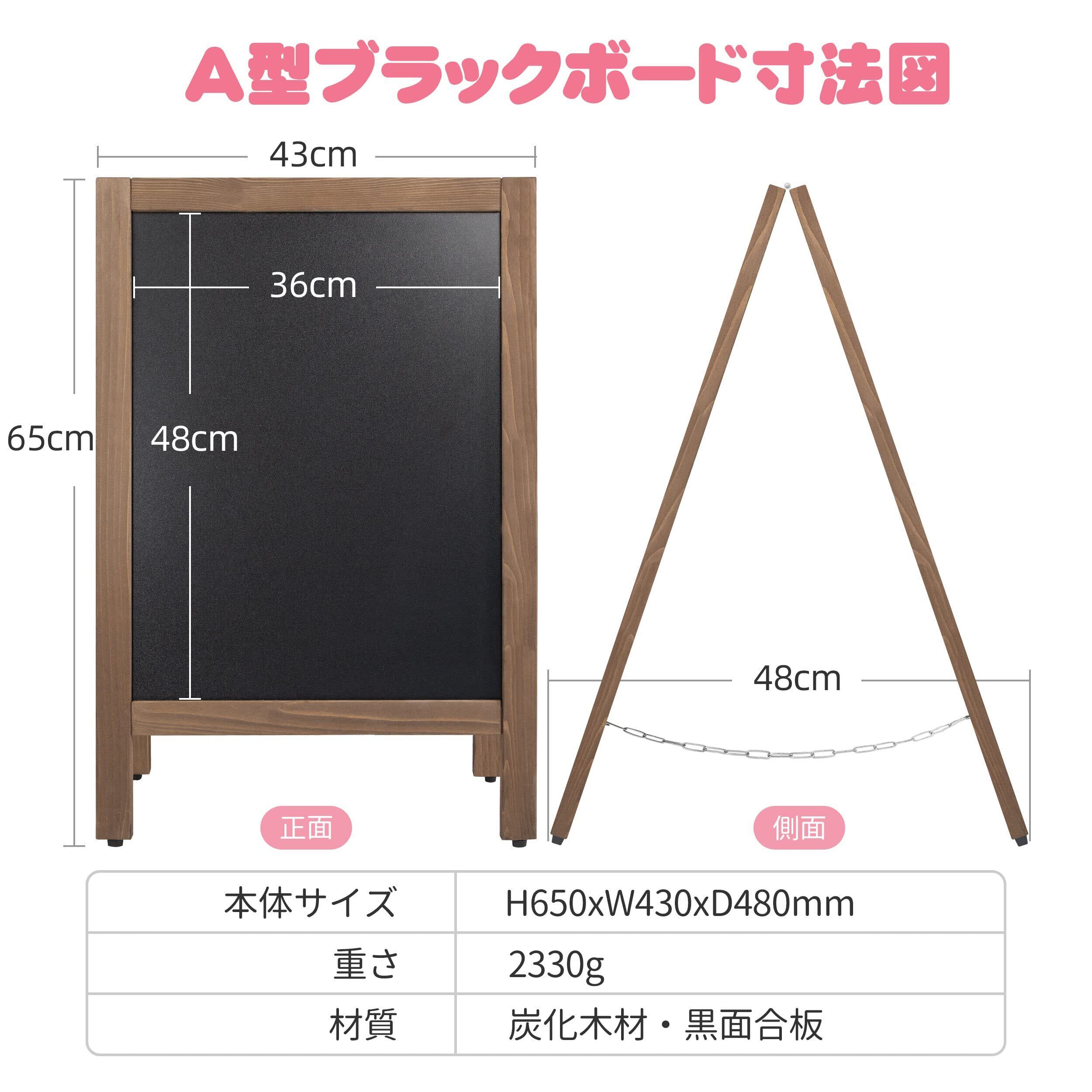 両面表示看板: このA型黒板は両面の内容を表示することができ、顧客の注目度を高めることができる。本体サイズ:幅43×高さ85×奥行き61 cm、ボード面サイズ :幅36×高さ58 cm、良質な炭マツ材を採用し、テクスチャがはっきりしており、耐久性があり、折れにくい。
