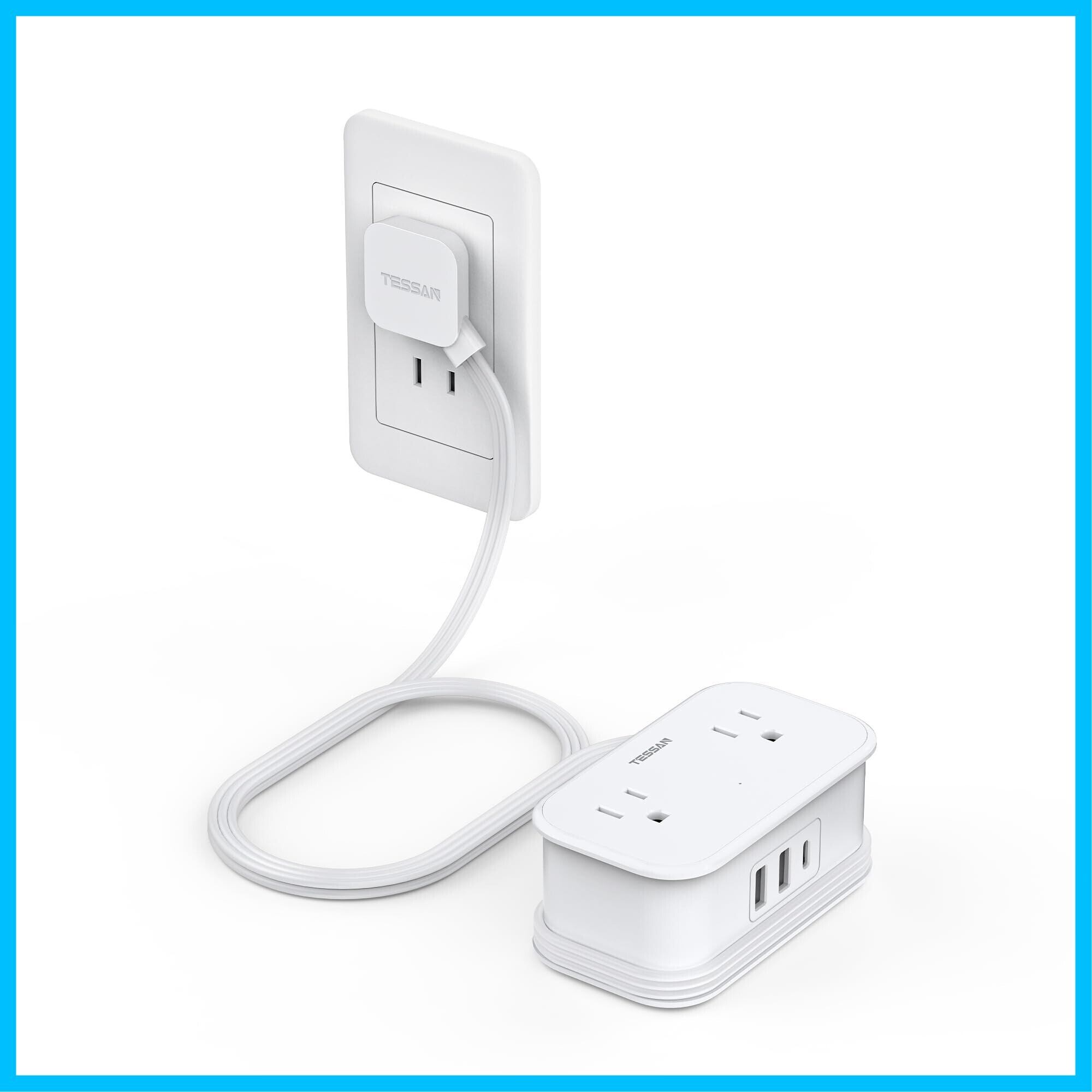 1台7役USB-C付き電源タップ:4個AC差込口、1つType-Cポートと2つUSB-A 1ポートを搭載し、最大7台デバイス同時に充電可能です。また、ACコンセントが前後に分散しているため、使用時に干渉を防ぎながら接続可能です。