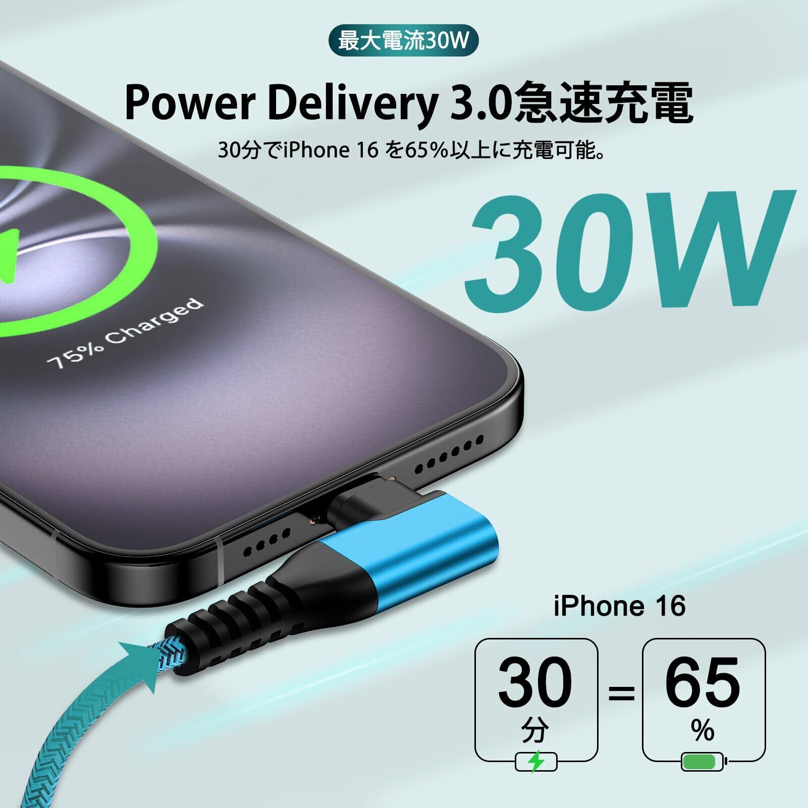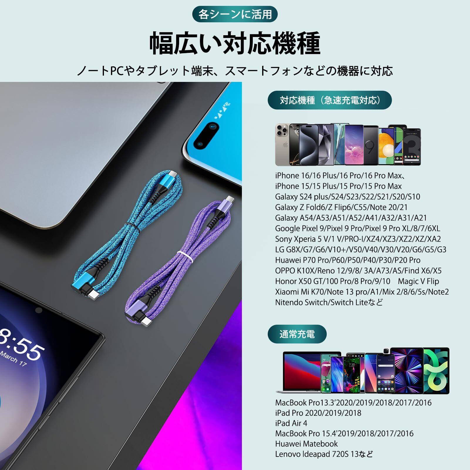 【PD3.0対応・30W急速充電】このUSB C to USB Cケーブルは最大30WのPowerDelivery3.0(PD3.0)に対応しており、スマートフォンやタブレット端末、ノートPC等のUSB-C機器に急速充電が可能です。USB PD対応の充電器と共に使用することでわずか1時間で、iPhone 16に90%まで、Samsung S24に95%まで充電することが可能です。アイフォン16付属の充電コードと同様の効率を発揮します。90度の角度をつけた急速充電ケーブルは、Quick Charge 4.0/3.0/2.0およびFCP、AFCと幅広い交換性があります。