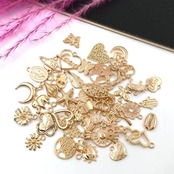 内容量:(内容物の指定はできません)100個 、サイズ:約15mm~25mm程度 (サイズは参考サイズです。デザインによって違います。) カラー:KC ゴールド、素材:金属(電気めっき)