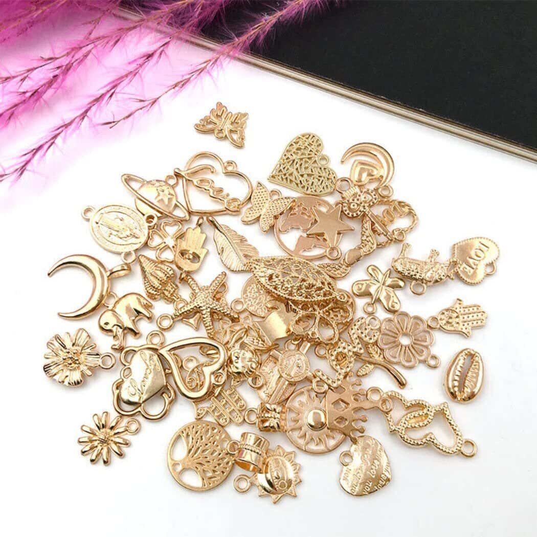 「[HappyHome] チャーム パーツ ペンダントトップ」は、100個入りのKCゴールドで、あなたの創造力を引き立てるアクセサリーパーツです。様々なデザインと形状が揃い、自分だけのオリジナルアクセサリーを簡単に作ることができます。自分自身や大切な人へのギフトとしても最適です!