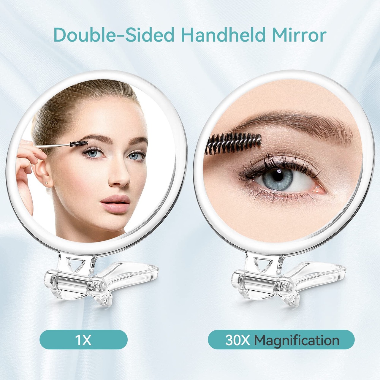 【暖かいヒント】30倍の拡大手鏡は非常に強力で、初めて使用するのは難しいかもしれません。 手鏡を顔から5cmほど離して持ち、はっきりと映るようになるまでごくゆっくりと遠ざけることをお勧めします。
