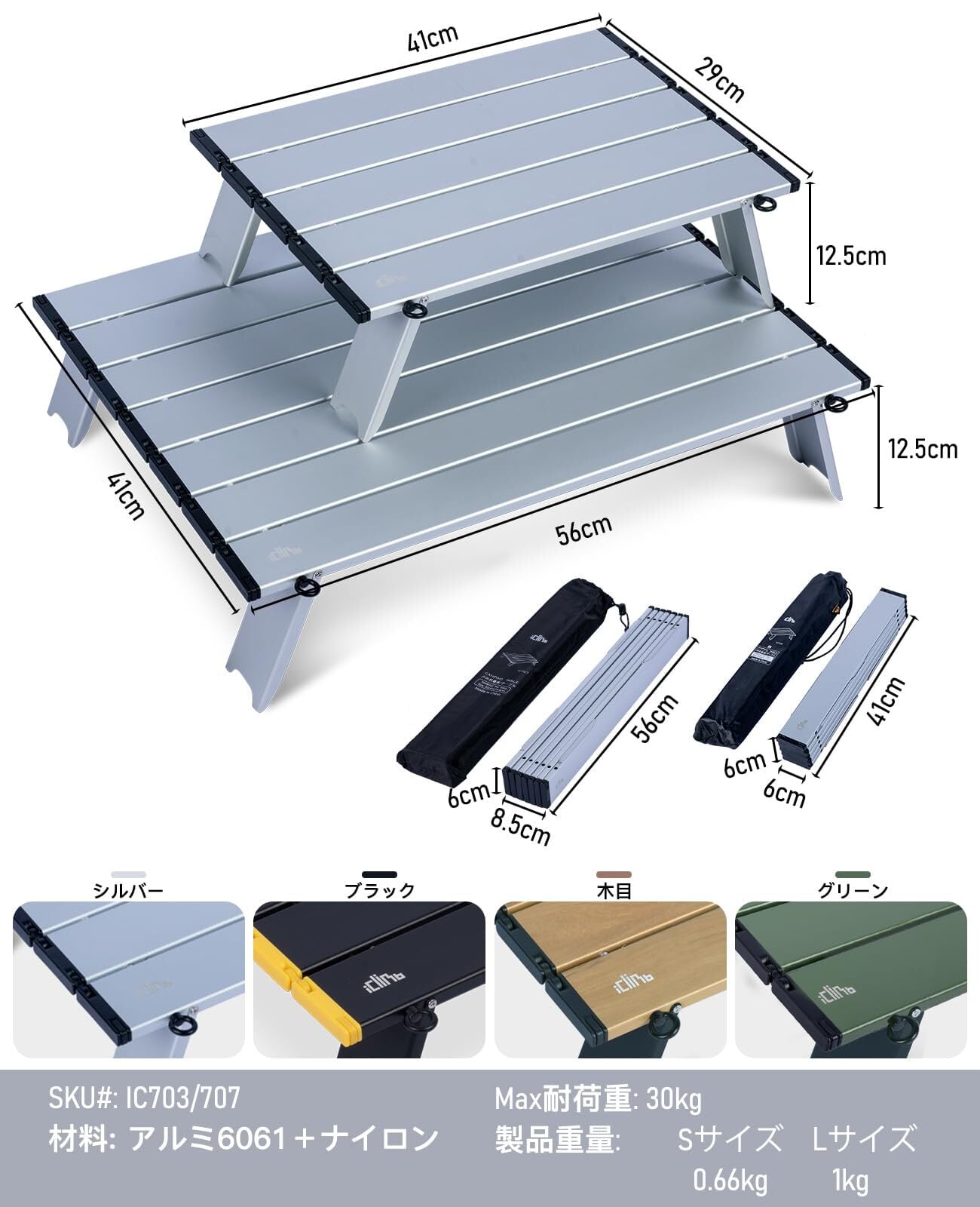 【iClimb(アィクライム)】キャンプ小型ローテーブル アルミロールテーブル ロール天板最新デザイン 耐久性強化 展開41X29X12.5cm(Sサイズ) 0.66kg超軽量 折りたたみ コンパクト 携帯便利 収納袋付き 耐熱 防水 防錆 耐腐食 耐荷重30kg S-Silver(シルバー)