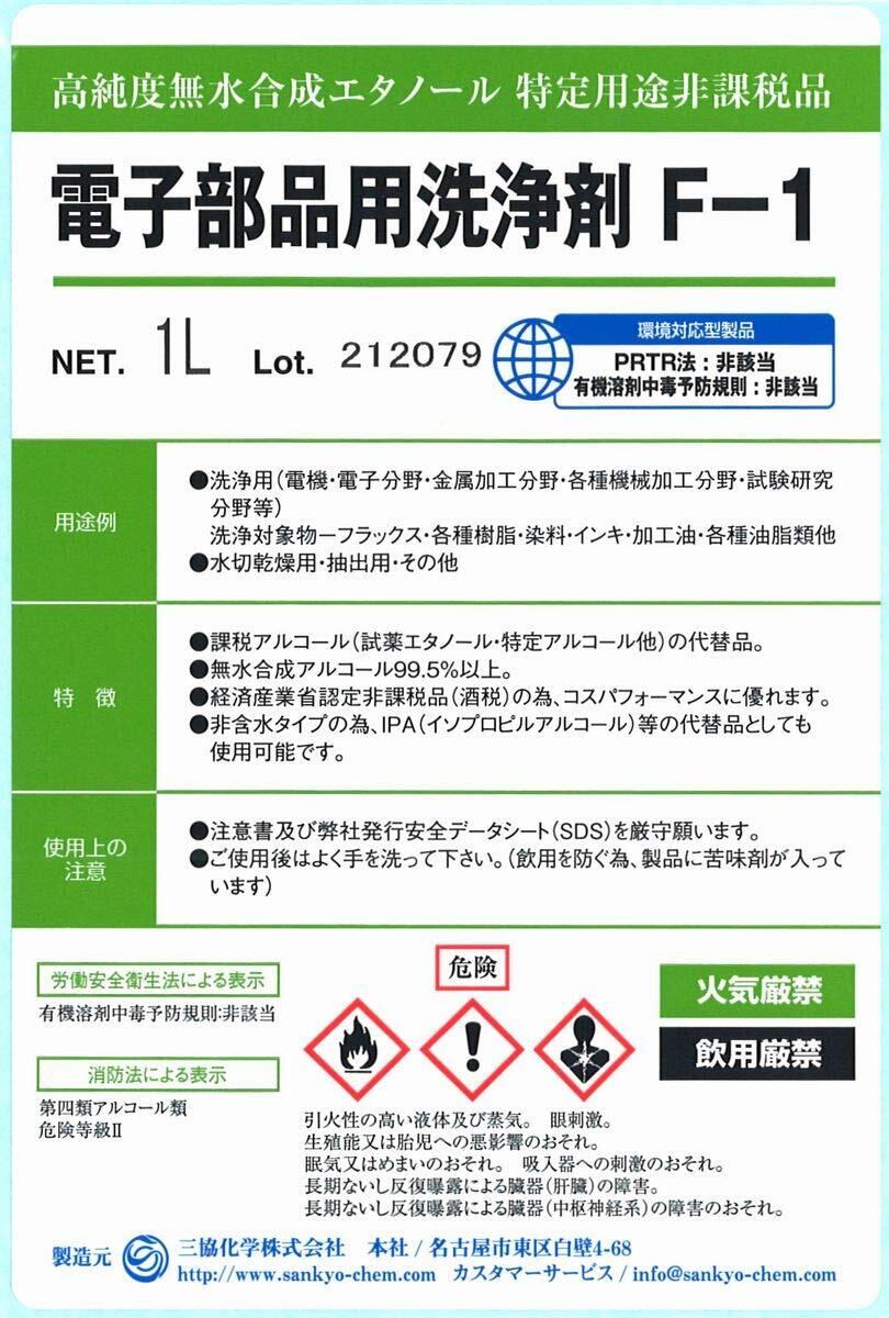 【無水エタノール】電子部品洗浄剤F-1 [1L] 三協化学 エタノール アルコール 無水エタノール 無水アルコール 99.5 有機溶剤中毒予防規則