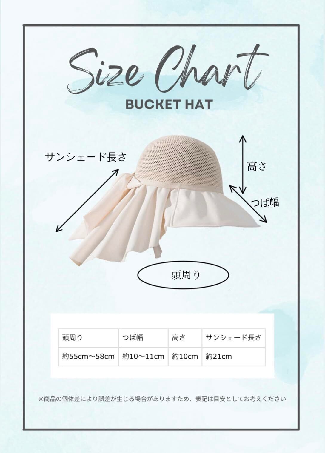 頭周り55〜58cm(調節可能) つば幅約10〜11cm 高さ約10cm サンシェード長さ約21cm