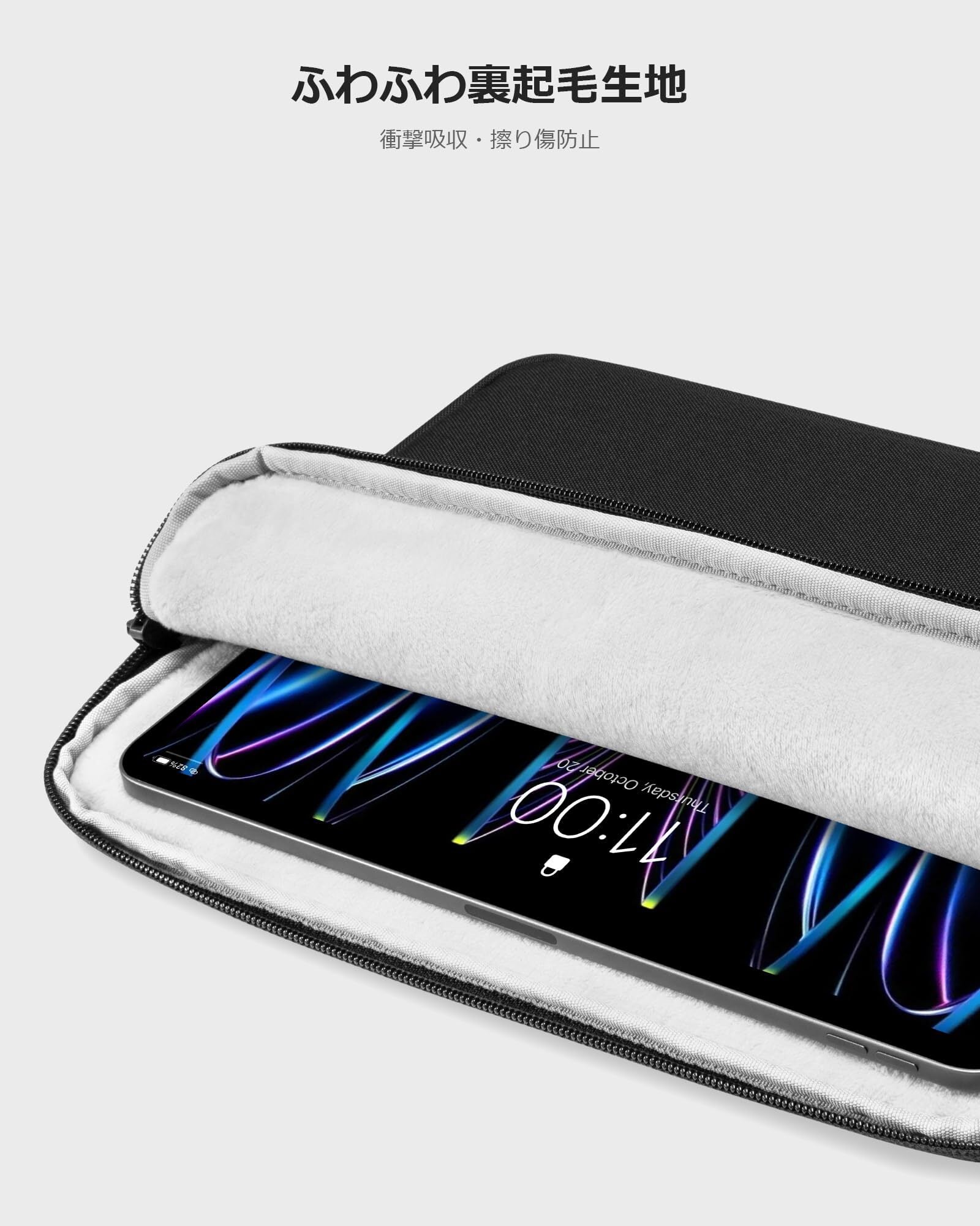 【タブレット保護】衝撃吸収パッドがあり、さらに、裏地は絹のような手触りのふわふわで、タブレットをすり傷、衝撃からしっかり保護します。撥水加工された表地使用、小雨でもご安心いただけます。