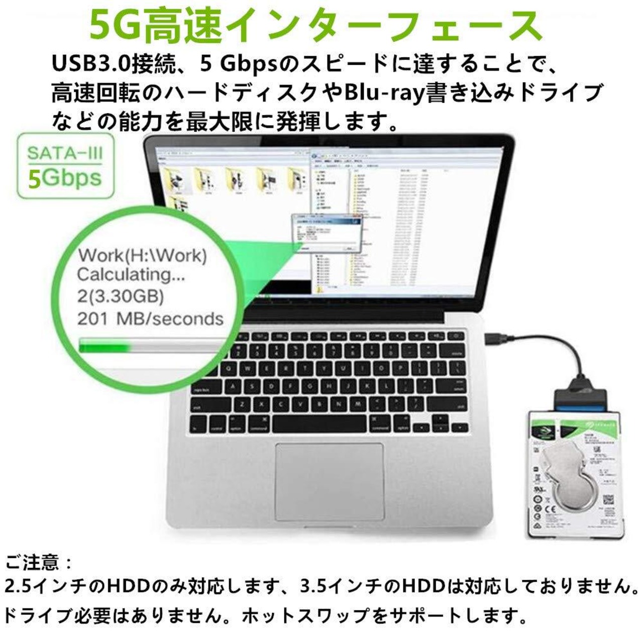 強大な互換性:2.5インチのSATAハードデイスクやSSDを、USB3.0接続ハードディスクに変換できるアダプタです。SATA / SATA2.0 / SATA3.0のインタフェース対応できます。(ご注意: 2.5インチのHDDのみ対応します、3.5インチのHDDは対応しておりません)